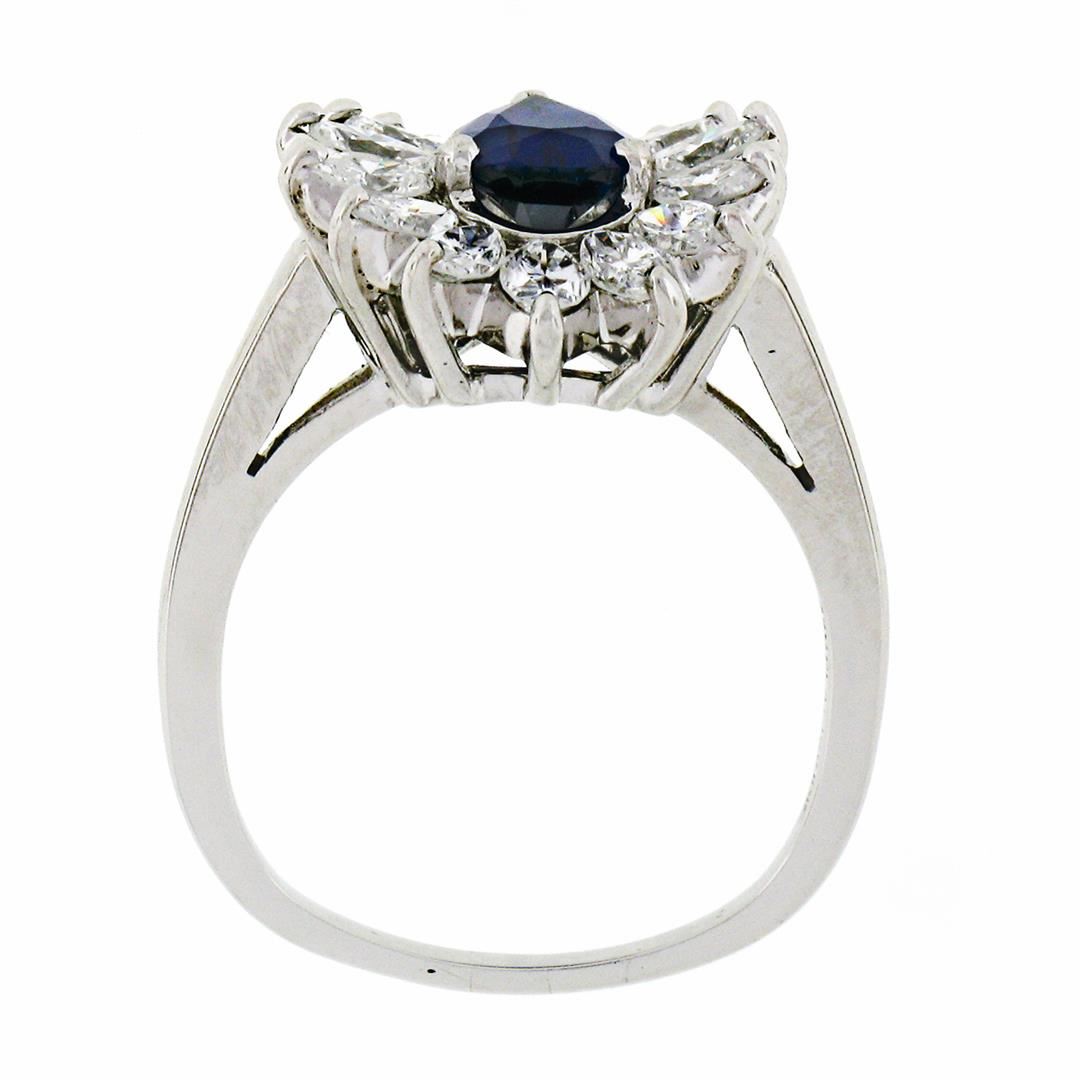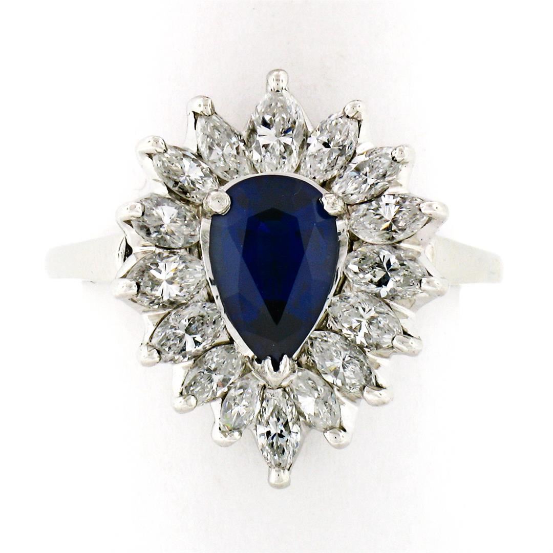 A vintage solid platinum ballerina cocktail ring, with 1 Gia certified pear cut natural sapphire (8.27 x 5.70 x 3.75 mm), and 16 marquise cut natural diamonds (F/G - VS1/VS2 ; 1.36ctw). The ring is size 8.5, weighs a total of 8.39 grams, and measures 18.7mm wide. Comes with all original relevant certifications.