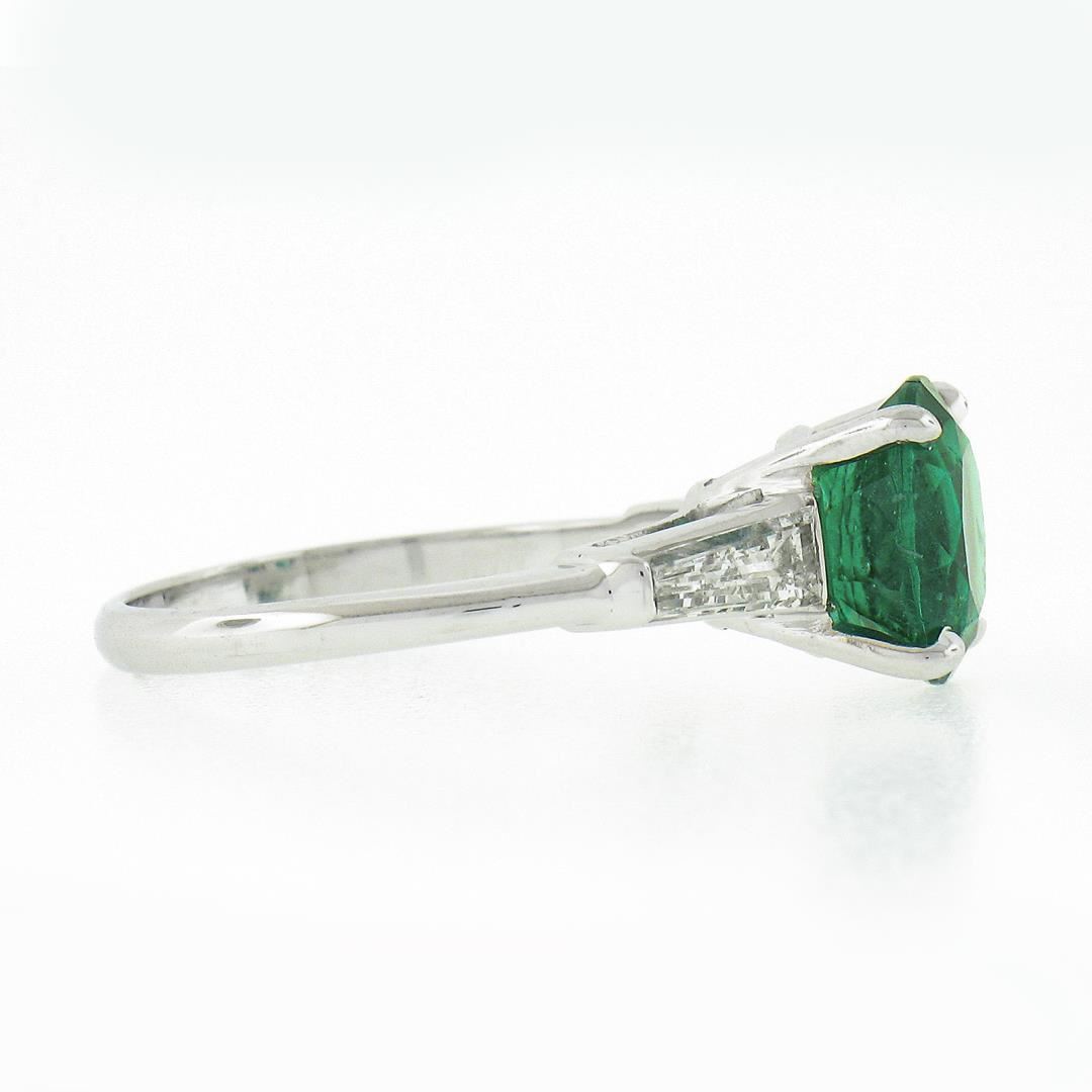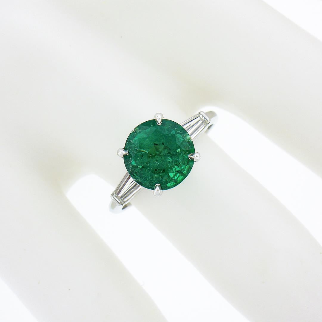 A vintage solid platinum ring, with 1 GIA graded round brilliant cut natural emerald (2.48ct), and 2 baguette cut natural diamonds (G/H - VS1/VS2 ; 0.56ctw). The ring is size 6.0, weighs a total of 4.12 grams, and measures 9mm wide. Comes with all original relevant certifications.