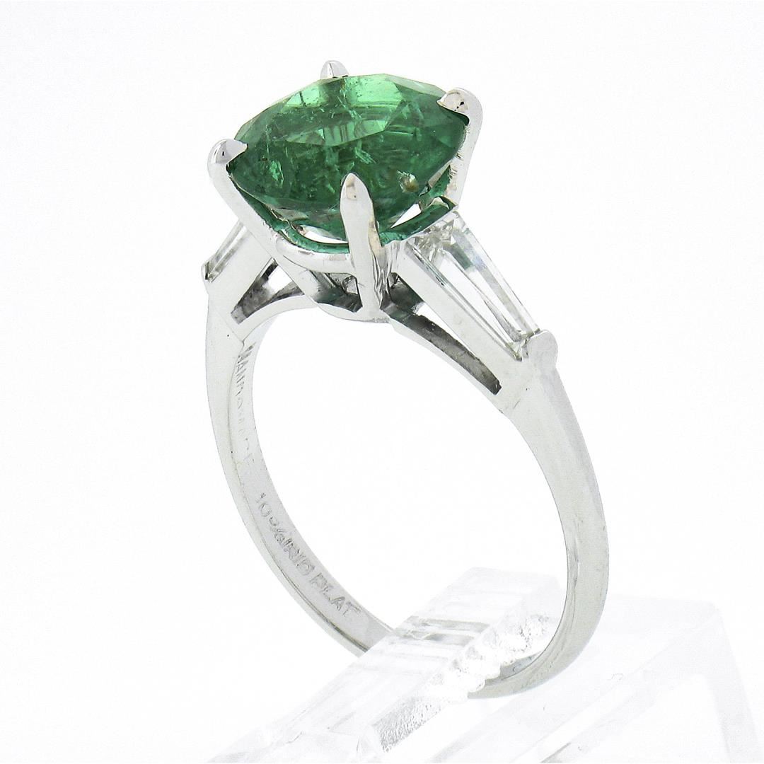 A vintage solid platinum ring, with 1 GIA graded round brilliant cut natural emerald (2.48ct), and 2 baguette cut natural diamonds (G/H - VS1/VS2 ; 0.56ctw). The ring is size 6.0, weighs a total of 4.12 grams, and measures 9mm wide. Comes with all original relevant certifications.