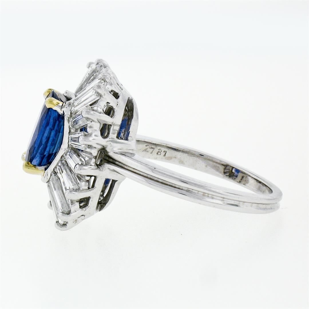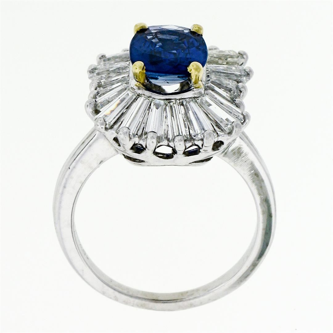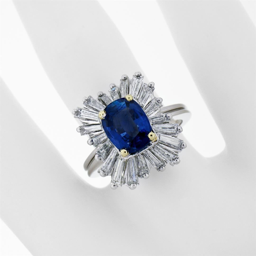 A vintage solid platinum and 18k yellow gold ballerina ring, with 1 AGL cretified cushion cut natural sapphire (2.08ct), and 20 baguette cut natural diamonds (F/G - VS1/VS2 ; 1.35ctw). The ring is size 6.0, weighs a total of 9.36 grams, and measures 15.0mm wide. Comes with all original relevant certifications.