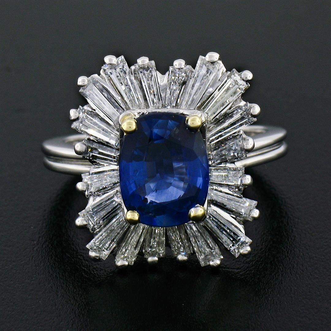 A vintage solid platinum and 18k yellow gold ballerina ring, with 1 AGL cretified cushion cut natural sapphire (2.08ct), and 20 baguette cut natural diamonds (F/G - VS1/VS2 ; 1.35ctw). The ring is size 6.0, weighs a total of 9.36 grams, and measures 15.0mm wide. Comes with all original relevant certifications.