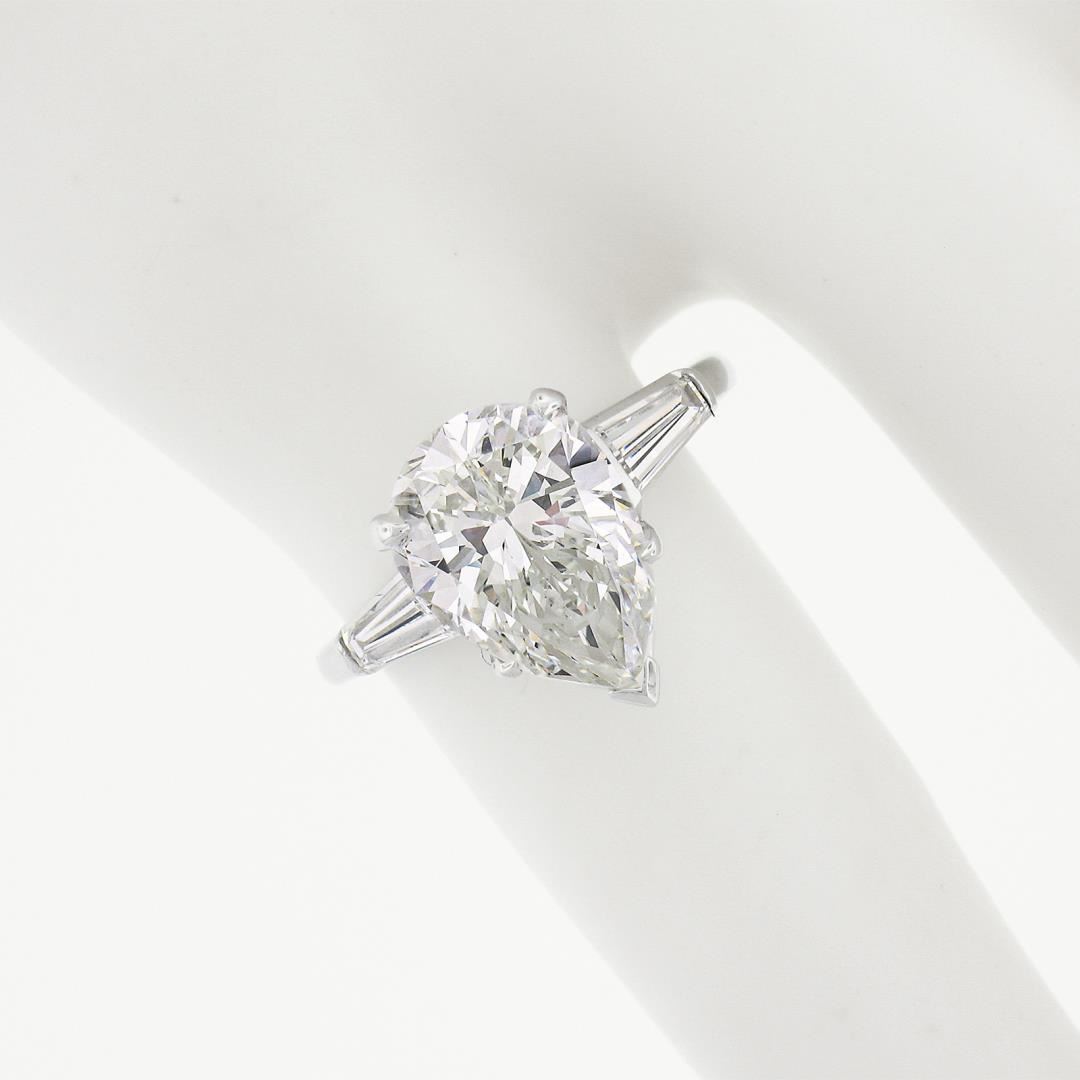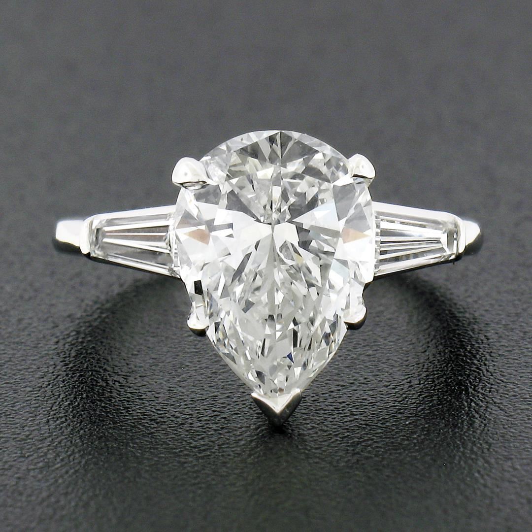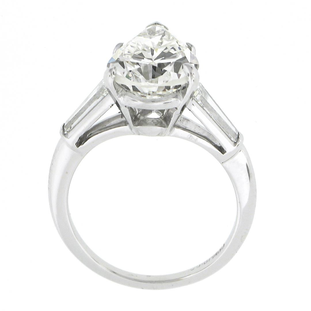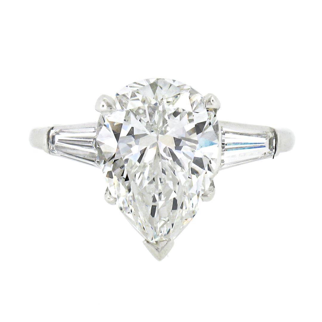 A vintage solid platinum engagement ring, with1 GIA graded pear cut natural diamond (H - VS2 ; 3.02ct), and 2 baguette cut natural diamonds (G/H - VS1/VS2 ; 0.60ctw). The ring is size 4.5, weighs a total of 4.82 grams, and measures 12.3mm wide. Comes with all original relevant certifications.
