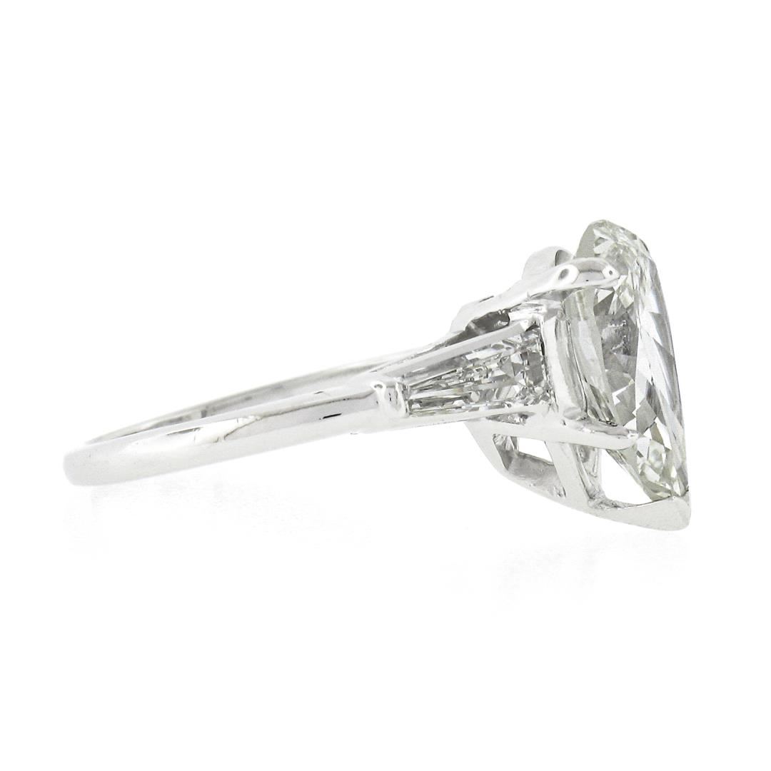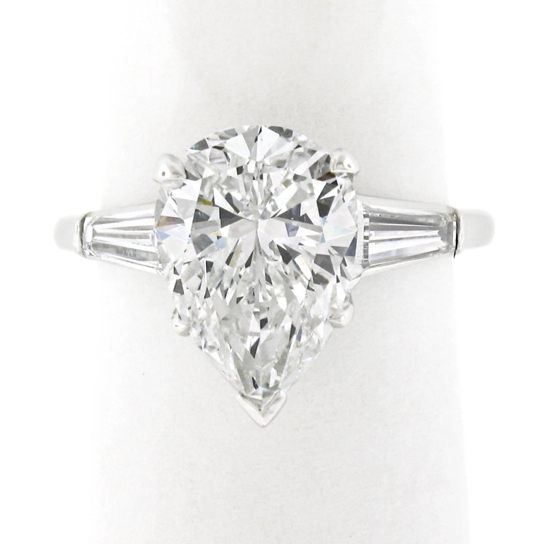 A vintage solid platinum engagement ring, with1 GIA graded pear cut natural diamond (H - VS2 ; 3.02ct), and 2 baguette cut natural diamonds (G/H - VS1/VS2 ; 0.60ctw). The ring is size 4.5, weighs a total of 4.82 grams, and measures 12.3mm wide. Comes with all original relevant certifications.