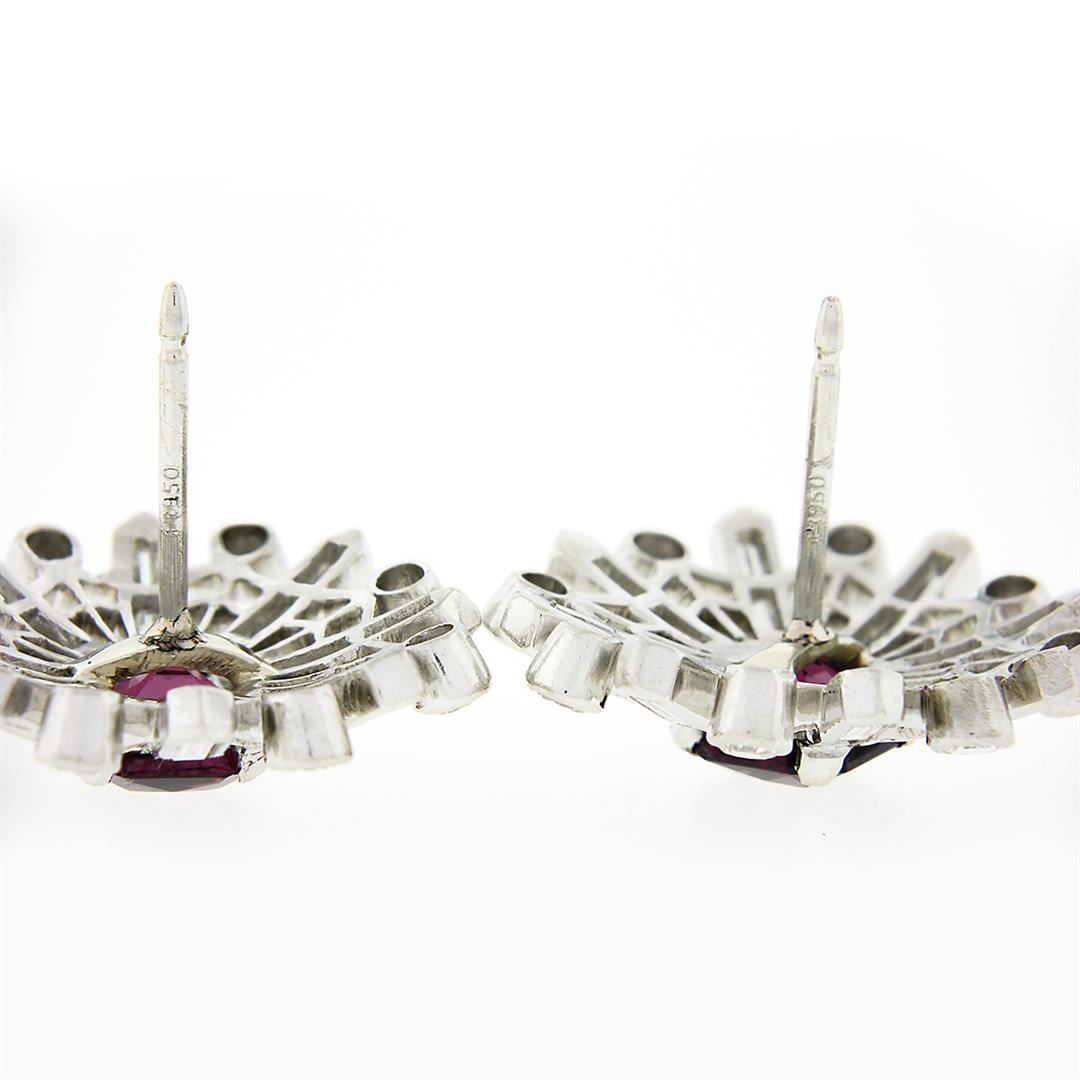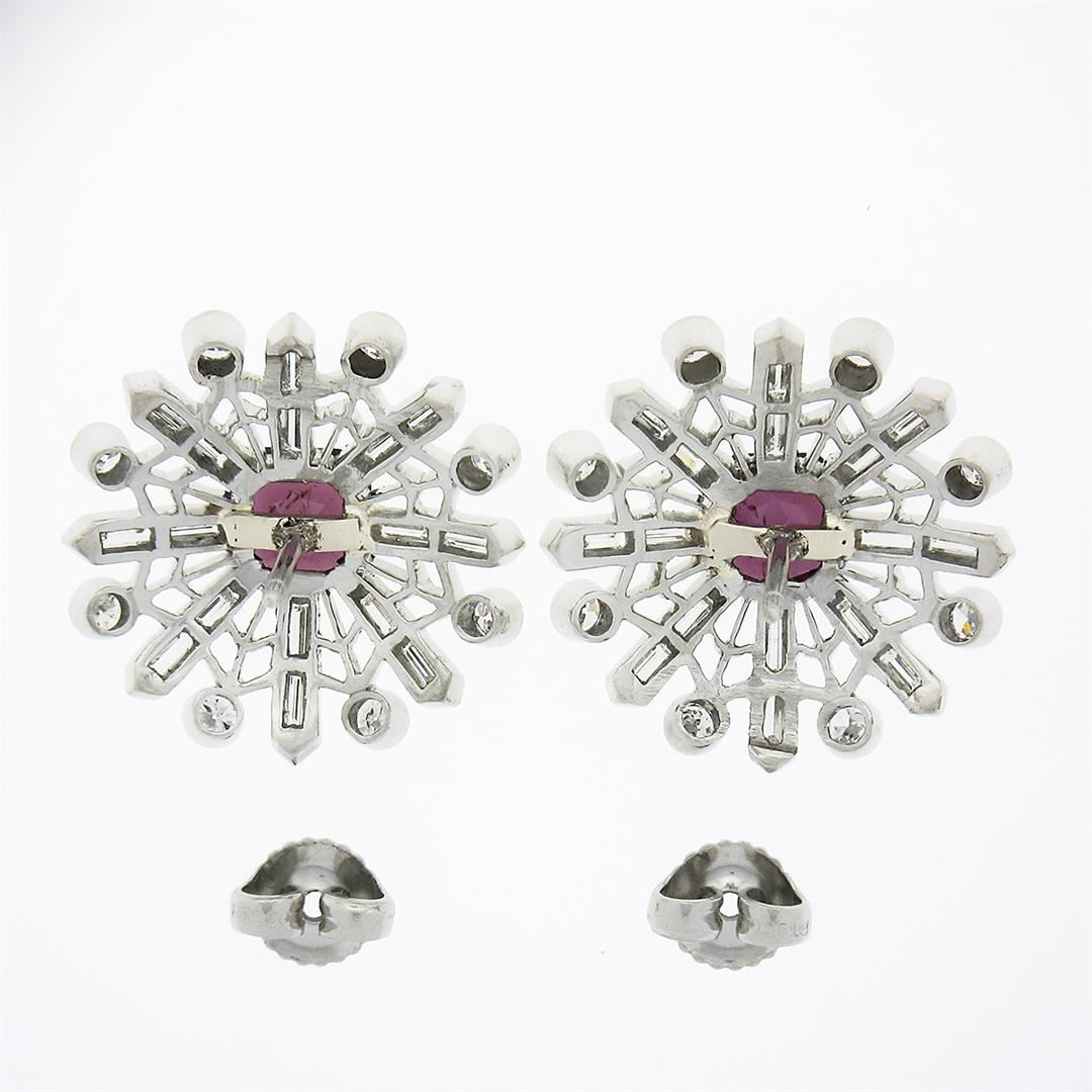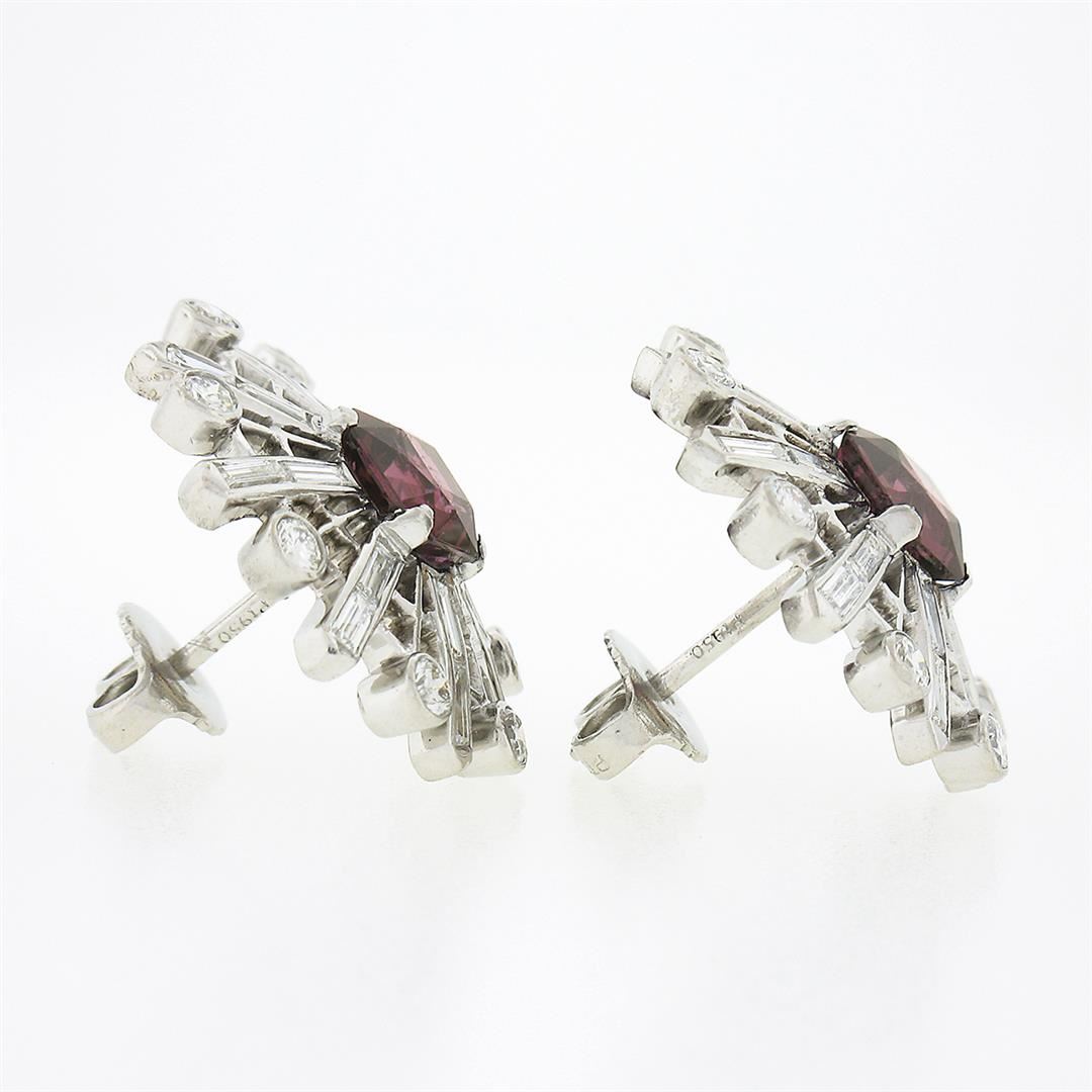 A vintage solid platinum pair of stud earrings, with 2 radiant cut natural garnets (2.0ctw), surrounded with 16 old transitional & 32 straight baguette cut natural diamonds (G/H - VS1/VS2 ; 2.02ctw). The earrings measure approximately 20.0mm in diameter and weigh a total of 10.24 grams.