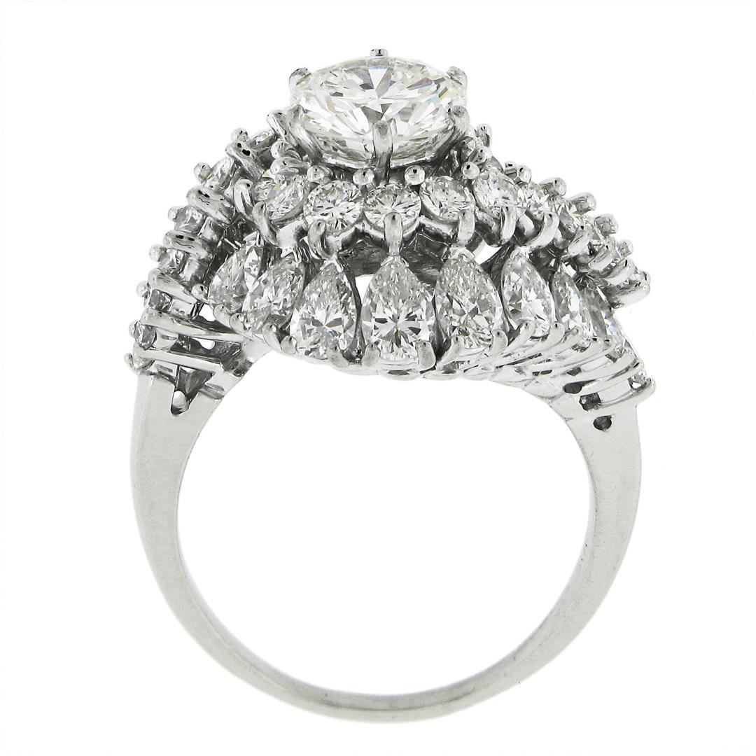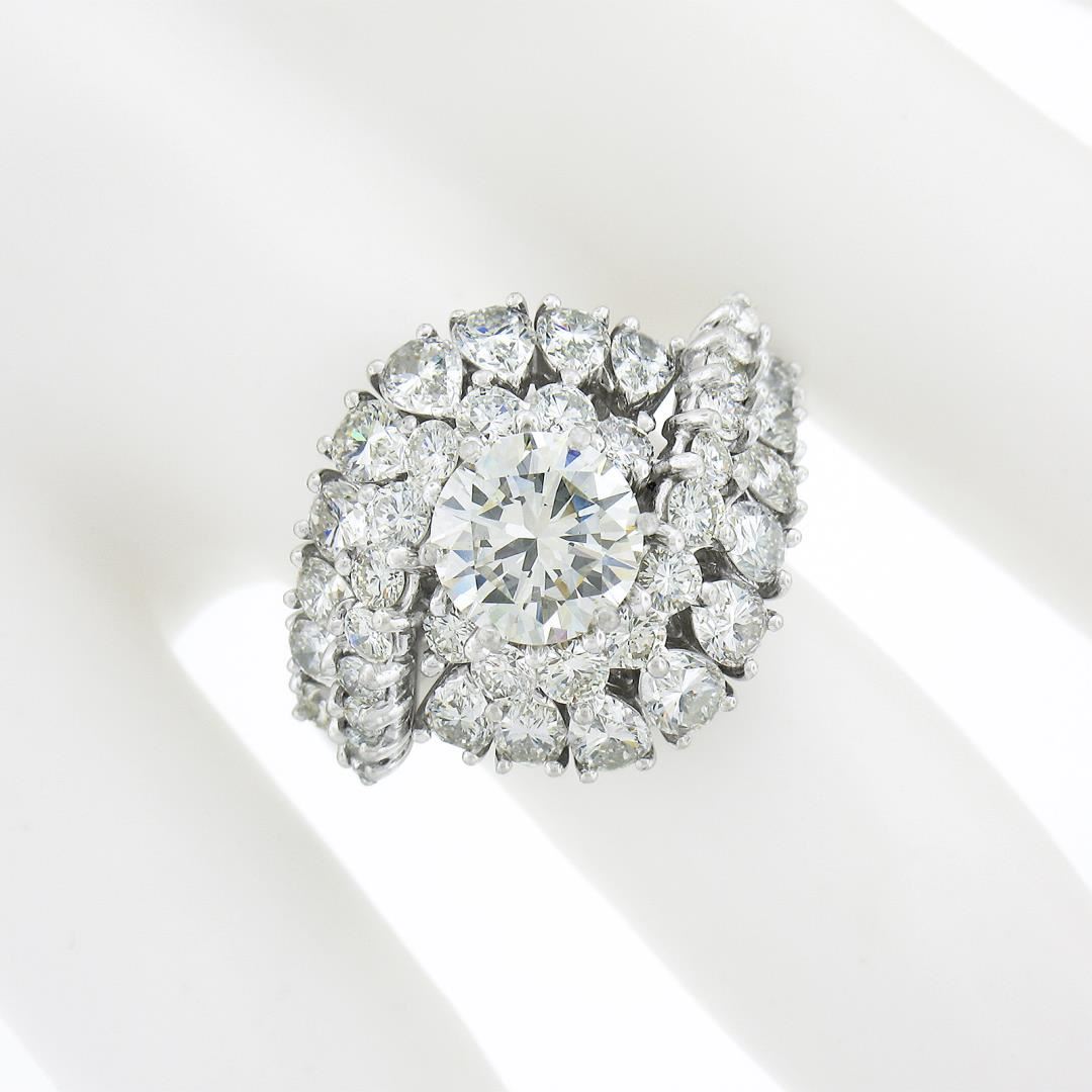 A vintage solid platinum swirl ring, with 1 GIA graded round brilliant cut natural diamond (J - SI2 ; 1.53ct), surrounded with a halo of 18 pear cut and 22 round brilliant cut natural diamonds (I/J Color - VS2/SI1 ; 3.05ctw). The ring is size 8.0, weighs a total of 11.46 grams, and measures 18.30mm wide. Comes with all original relevant certifications.