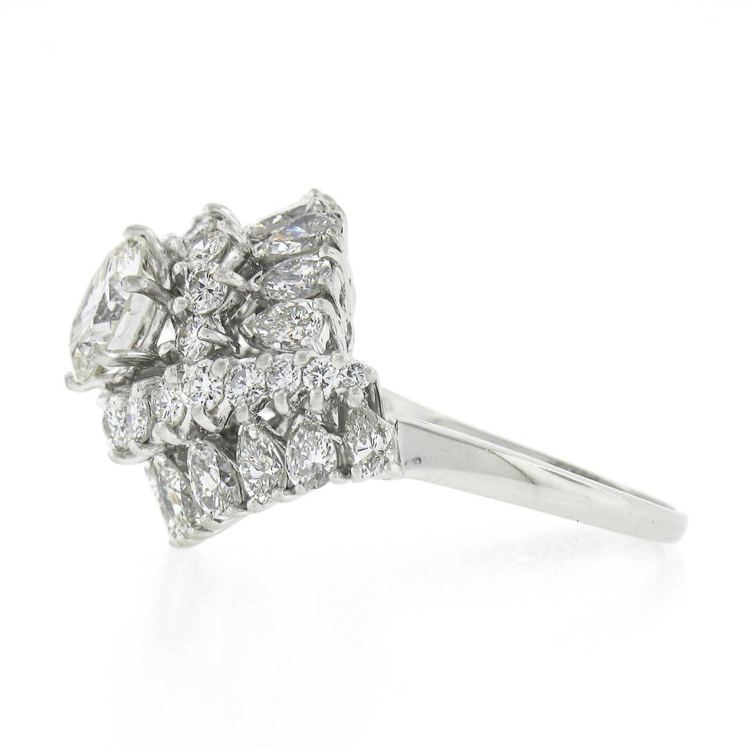 A vintage solid platinum swirl ring, with 1 GIA graded round brilliant cut natural diamond (J - SI2 ; 1.53ct), surrounded with a halo of 18 pear cut and 22 round brilliant cut natural diamonds (I/J Color - VS2/SI1 ; 3.05ctw). The ring is size 8.0, weighs a total of 11.46 grams, and measures 18.30mm wide. Comes with all original relevant certifications.