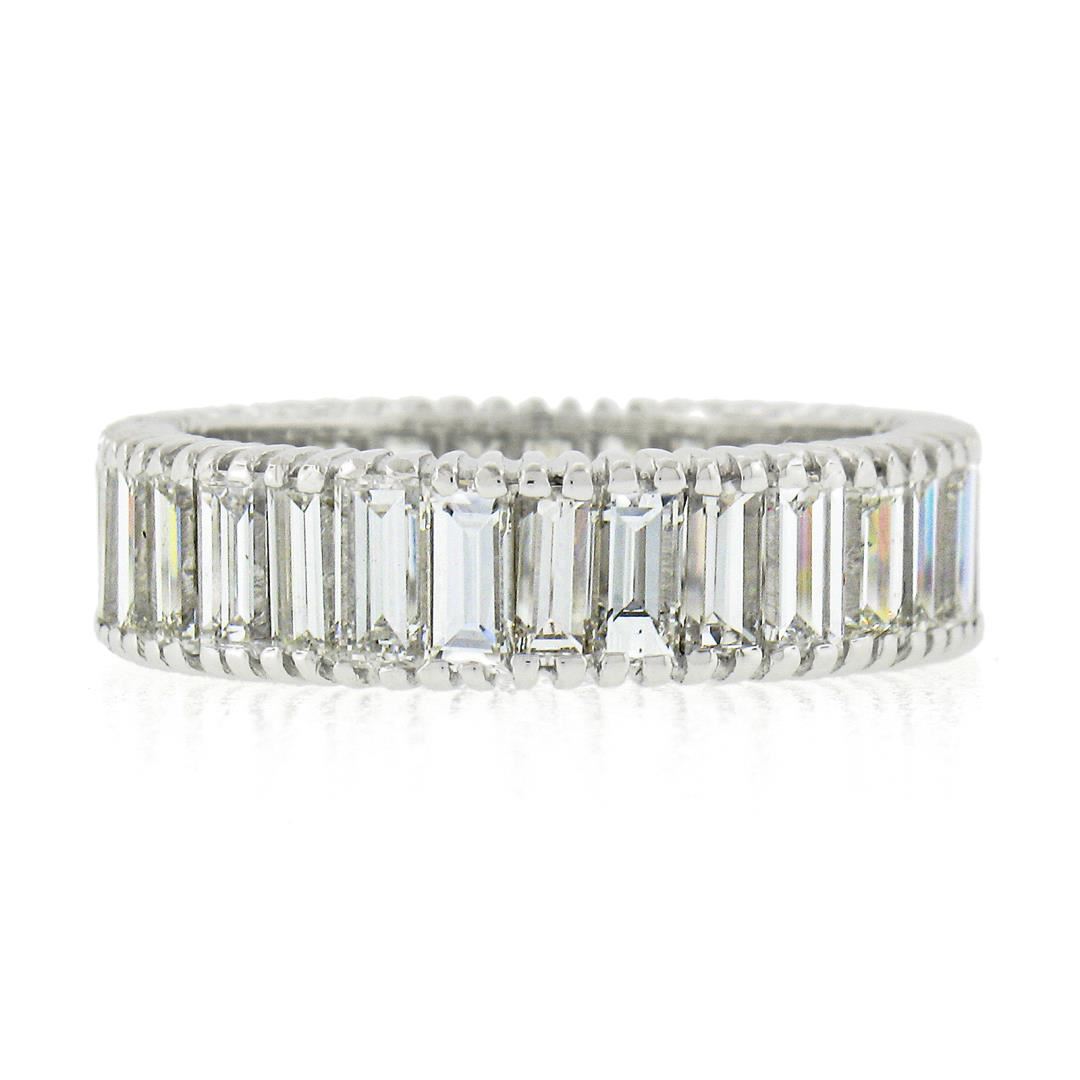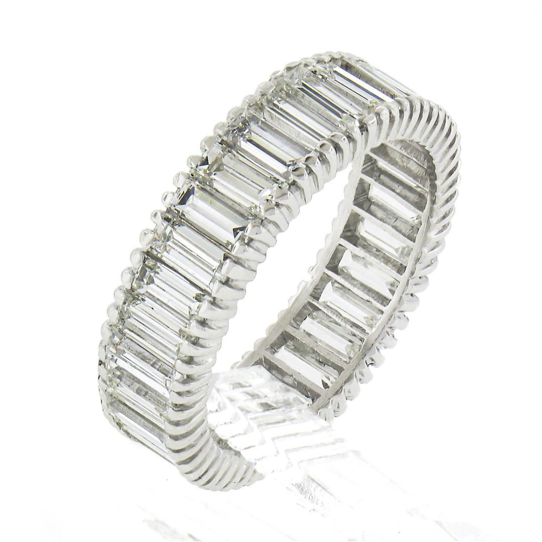 A vintage solid platinum band ring, with 31 straight baguette cut natural diamonds (G/H - VS1/VS2 w/ a few SI1 ; 4.60ctw). The ring is size 7.0, weighs a total of 5.27 grams, and measures 5.7mm wide.