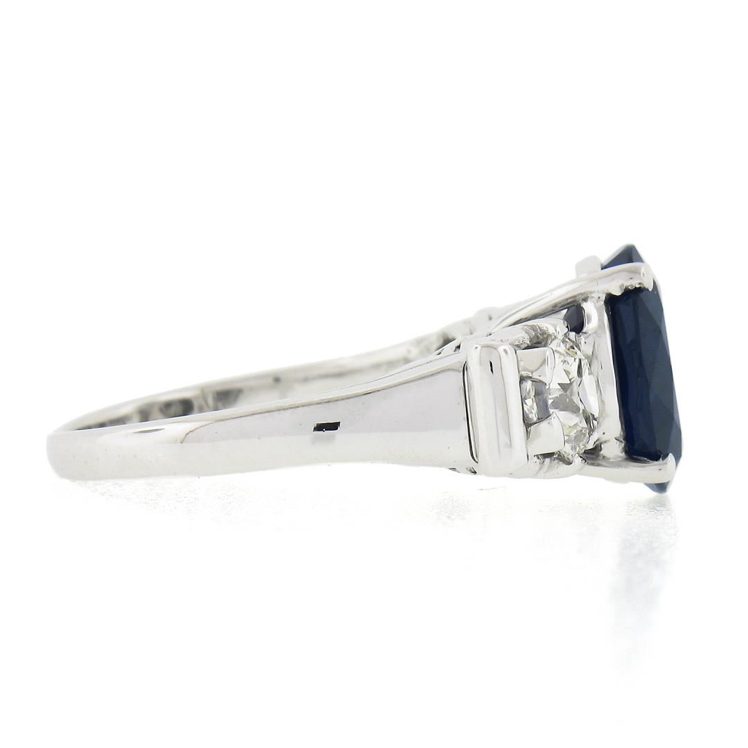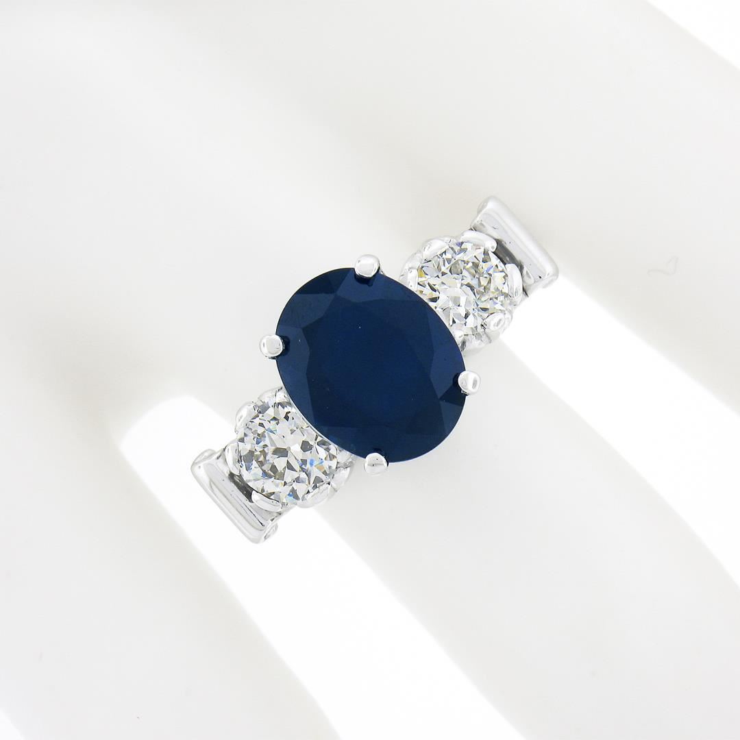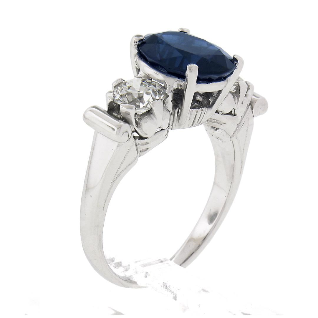 A vintage solid platinum ring, with 1 GIA garded oval cut natural sapphire (3.85ct), and 2 old european cut natural diamonds (G/H - VS1/VS2 ; 1.10ctw ). The ring is size 7.5, weighs a total of 9.42 grams, and measures 10.7mm wide. Comes with all original relevant certifications.
