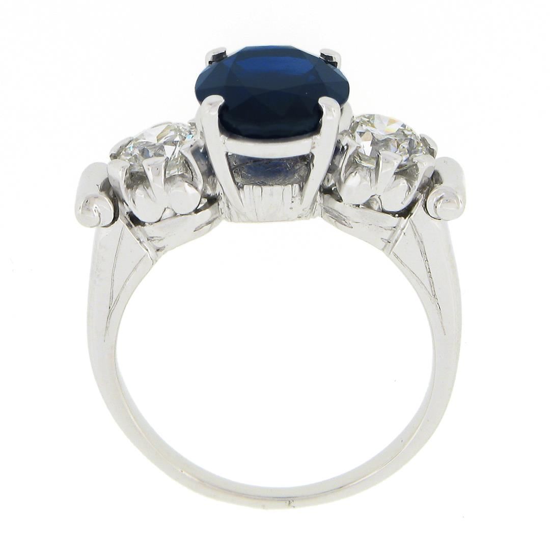 A vintage solid platinum ring, with 1 GIA garded oval cut natural sapphire (3.85ct), and 2 old european cut natural diamonds (G/H - VS1/VS2 ; 1.10ctw ). The ring is size 7.5, weighs a total of 9.42 grams, and measures 10.7mm wide. Comes with all original relevant certifications.