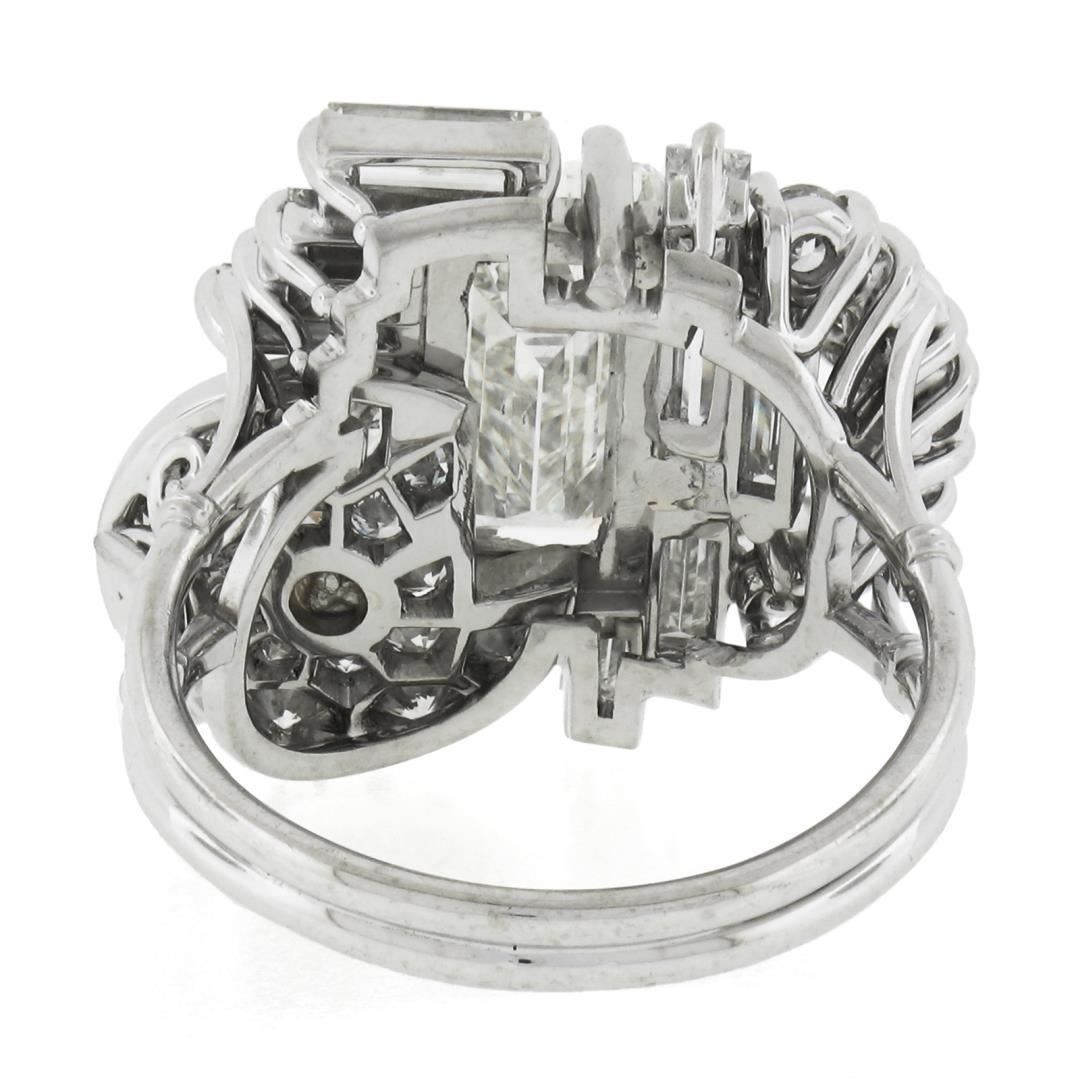A vintage solid platinum cocktail ring, with 1 GIA graded emerald cut natural diamond (H - SI2 ; 3.00ct ), and 9 baguette cut, 21 round & single cut natural diamonds (G/H - VVS2/VS1 ; 2.10ctw). The ring is size 5.5, weighs a total of 9.08 grams, and measures 17.5mm wide. Comes with all original relevant certifications.