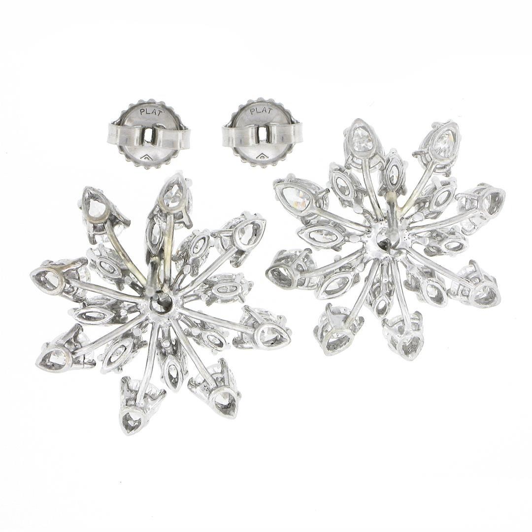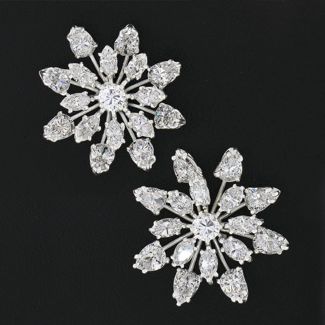 A vintage solid platinum snowflake spray earrings, with 16 pear cut, 16 marquise cut & 2 round brilliant cut natural diamonds (F/G - VS1/VS2 ; 6.40ctw). The earrings measure approximately 24.20x23.30mm and weigh a total of 9.71 grams.