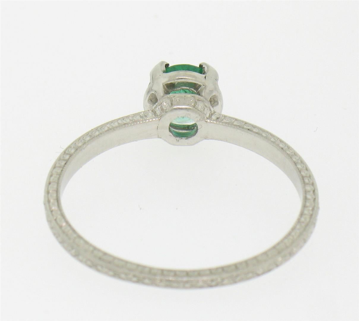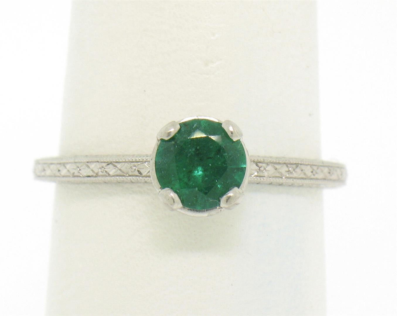 A vintage solid platinum solitaire ring, featuring 1 round brilliant cut natural emerald (0.51ct). The ring is size 8, weighs a total of 3.20 grams, and measures 6.30mm wide.