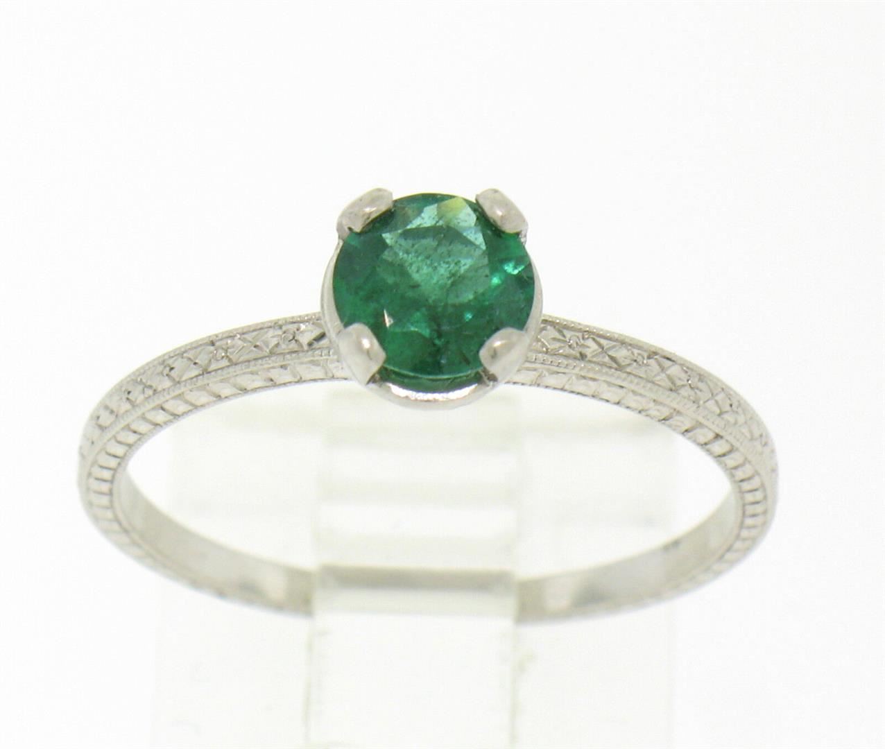 A vintage solid platinum solitaire ring, featuring 1 round brilliant cut natural emerald (0.51ct). The ring is size 8, weighs a total of 3.20 grams, and measures 6.30mm wide.