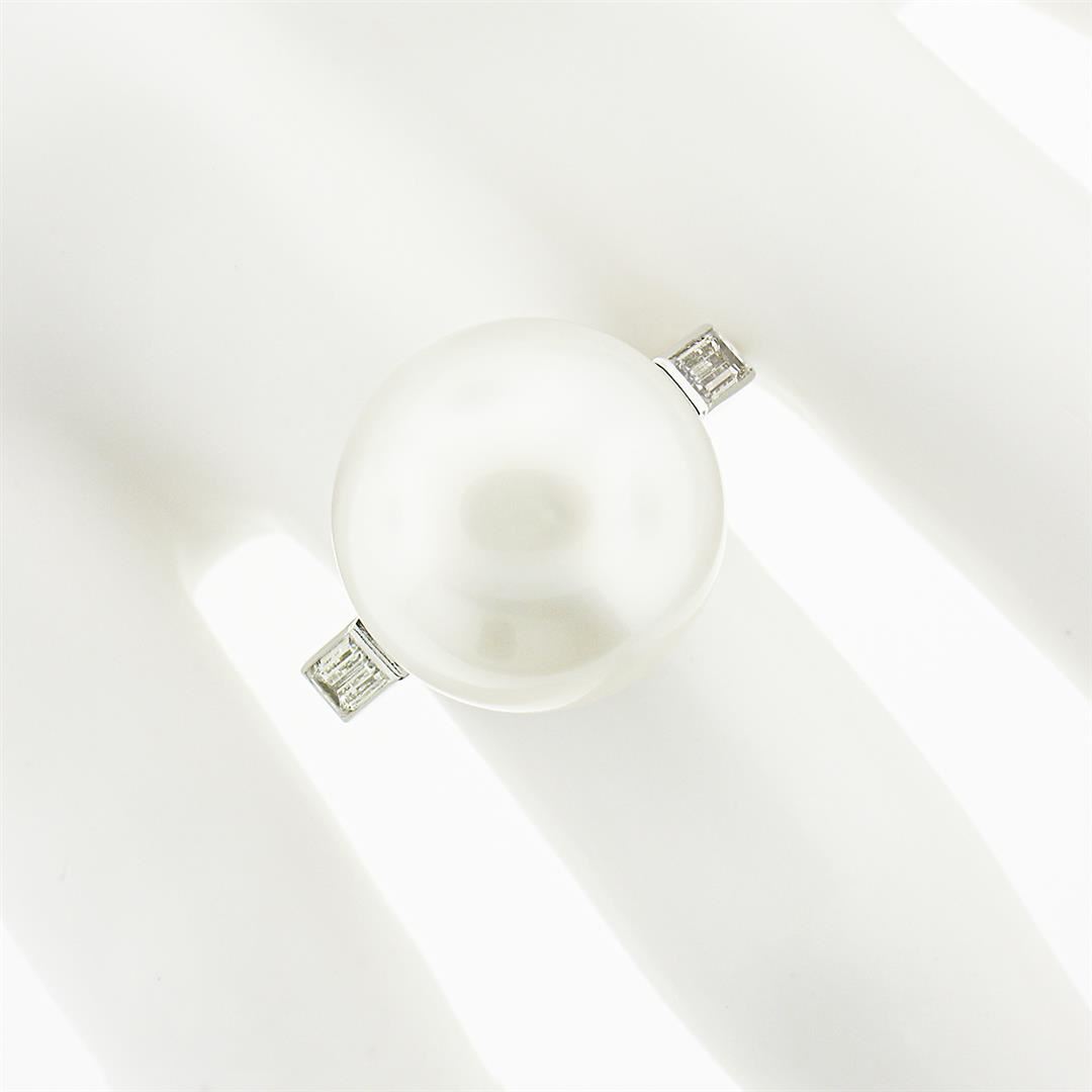 A solid platinum ring, with 1 Gia certified button shape cultured pearl (14.88mm), and 2 straight baguette cut natural diamonds (G/H - VS1/VS2 ; 0.60ctw). The ring is size 6.5, weighs a total of 13.42 grams, and measures 14.8mm wide. Comes with all origin