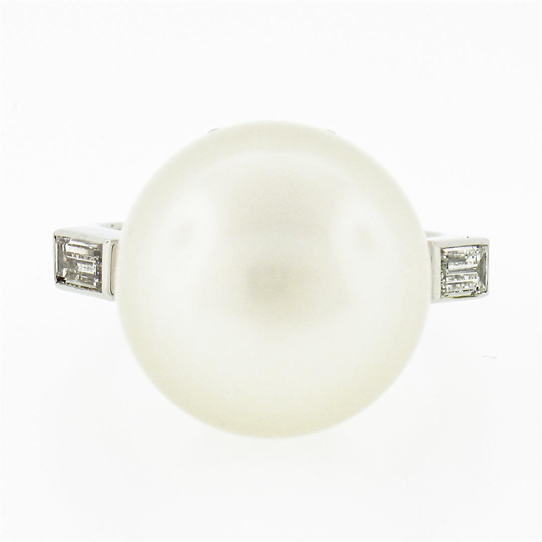 A solid platinum ring, with 1 Gia certified button shape cultured pearl (14.88mm), and 2 straight baguette cut natural diamonds (G/H - VS1/VS2 ; 0.60ctw). The ring is size 6.5, weighs a total of 13.42 grams, and measures 14.8mm wide. Comes with all origin