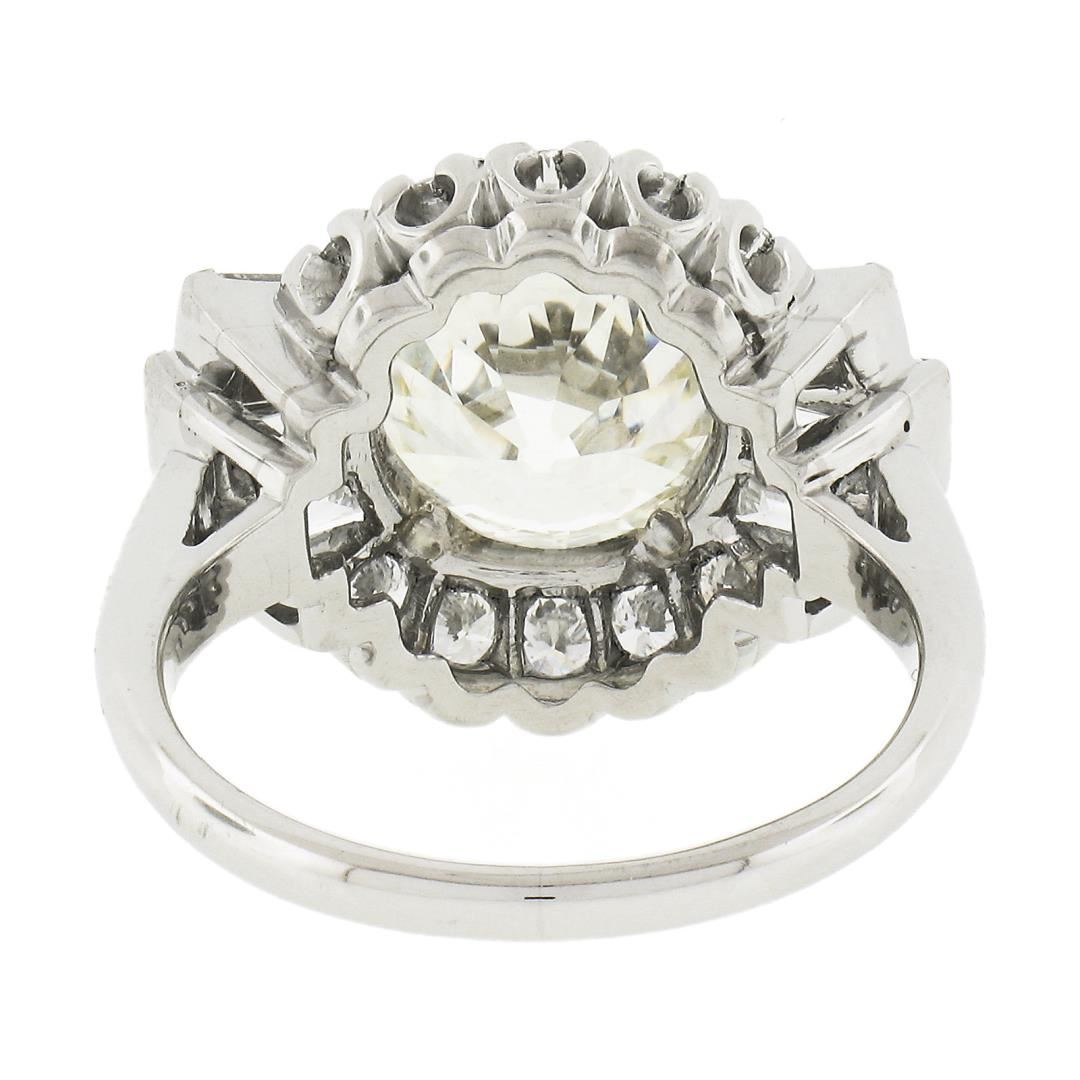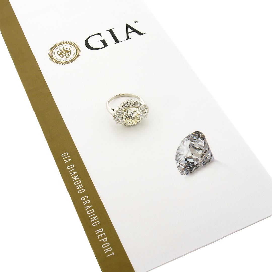 A vintage solid platinum engagement ring, featuring 1 GIA graded old cut natural diamond (N - VVS1 ; 4.31ct), 6 tapered baguette cut natural diamonds (F/G - VVS2-VS2 ; 0.85ctw), and 10 transtional & round brilliant cut natural diamonds (F/G - VS1/VS2 ; 0.40ctw ). The ring is size 6.5, weighs a total of 10.06 grams, and measures 15.8mm wide. Comes with all original relevant certifications.
