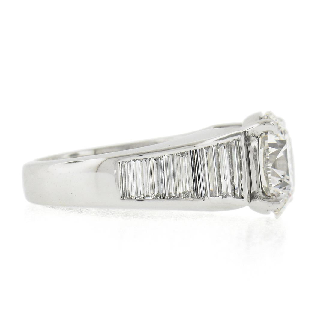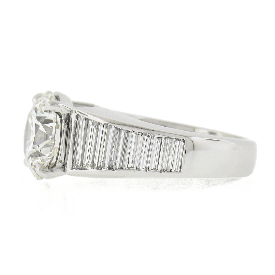 A vintage solid platinum engagement ring, with 1 GIA graded round cut natural diamond (G - SI1 ; 3.17ct), accented with 20 baguette cut natural diamonds (G/H - VS1/VS2 ; 1.85ctw). The ring is size 5.5, weighs a total of 10.51 grams, and measures 9.45mm wide. Comes with all original relevant certifications.