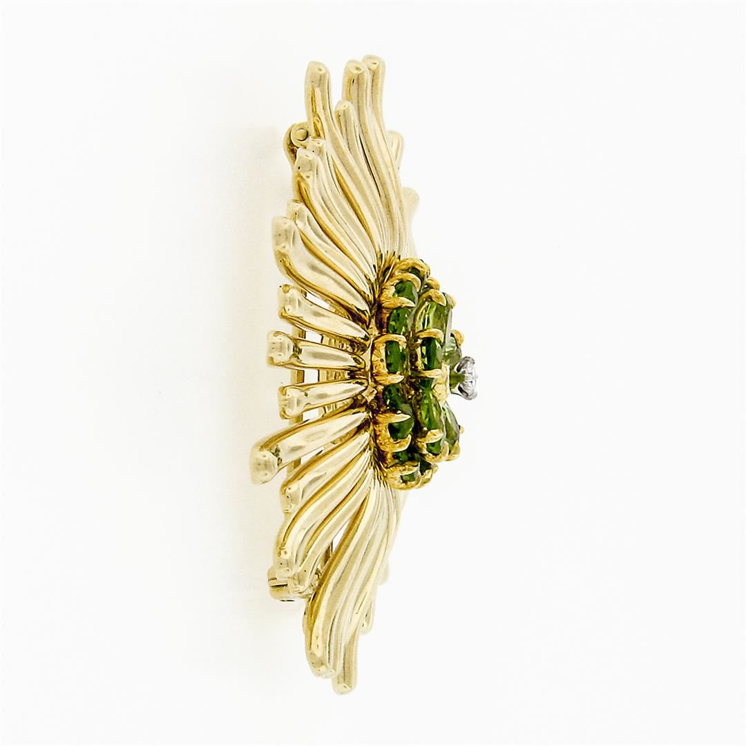 A vintage solid 14k yellow gold pin brooch, with 14 oval brilliant cut natural peridot (9.50ctw ), and 1 round brilliant cut natural diamond (F - VS1 ; 0.13ct). Measures 58.3mm in diameter and weighs a total of 39.32 grams.