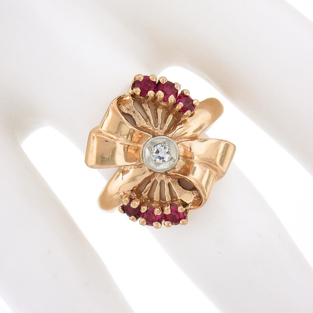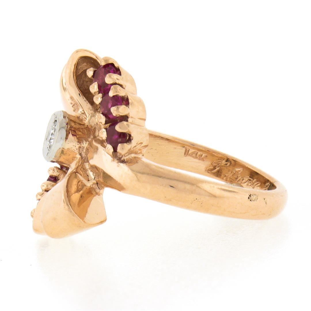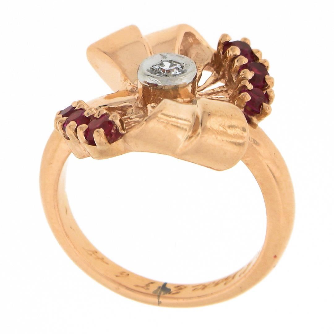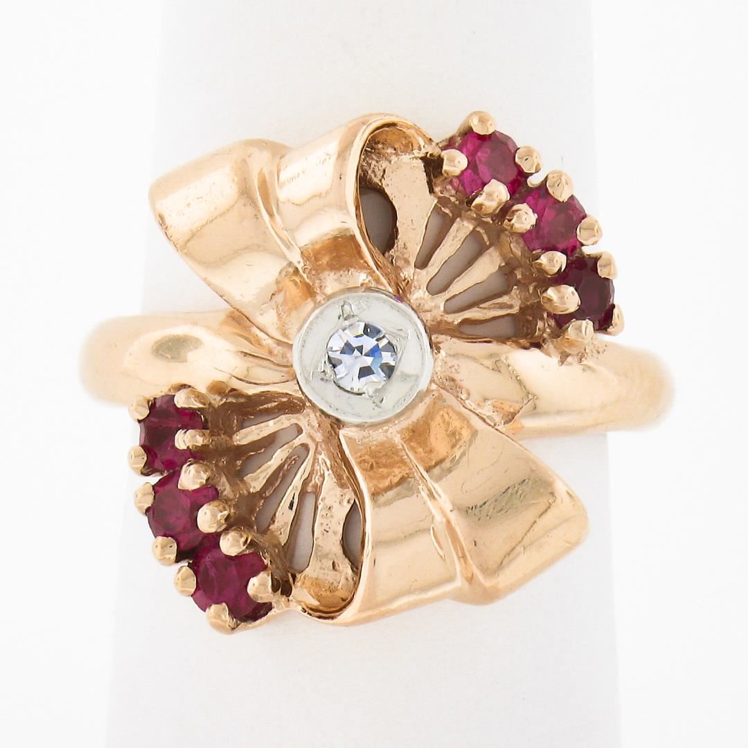 A vintage retro solid 14k rose gold bow ring, with 1 old single cut natural diamond (G - VS2 ; 0.05ct), and 6 old round cut red stones (2.8mm each). The ring is size 6.5, weighs a total of 7.05 grams, and measures 17mm wide.