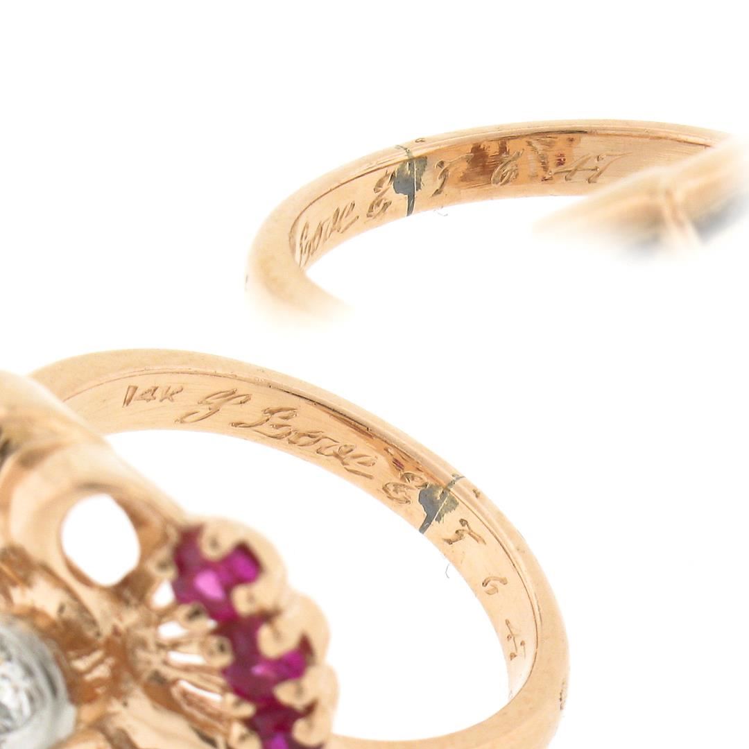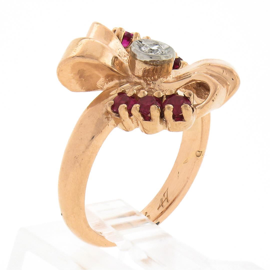 A vintage retro solid 14k rose gold bow ring, with 1 old single cut natural diamond (G - VS2 ; 0.05ct), and 6 old round cut red stones (2.8mm each). The ring is size 6.5, weighs a total of 7.05 grams, and measures 17mm wide.