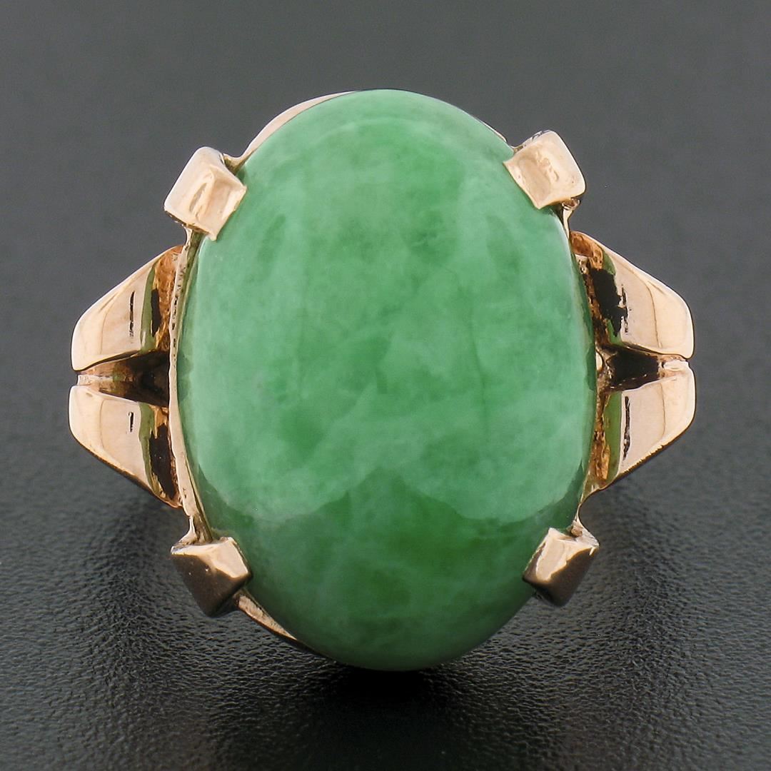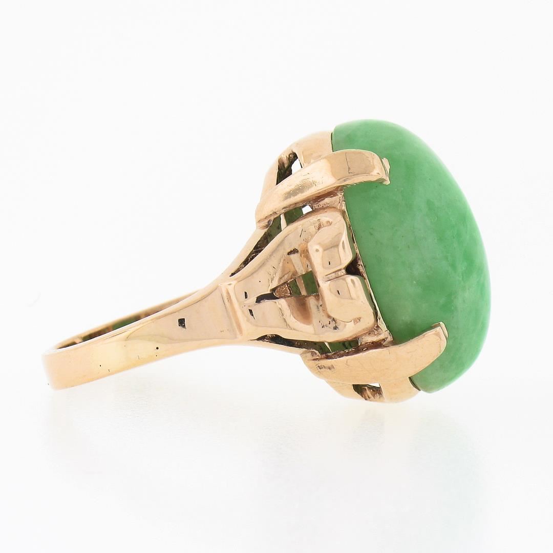 A vintage solid 14k yellow gold ring, with 1 oval cabochon cut natural mebled jade (17.9x13mm). The ring is size 6.0, weighs a total of 8.59 grams, and measures 17.9mm wide.
