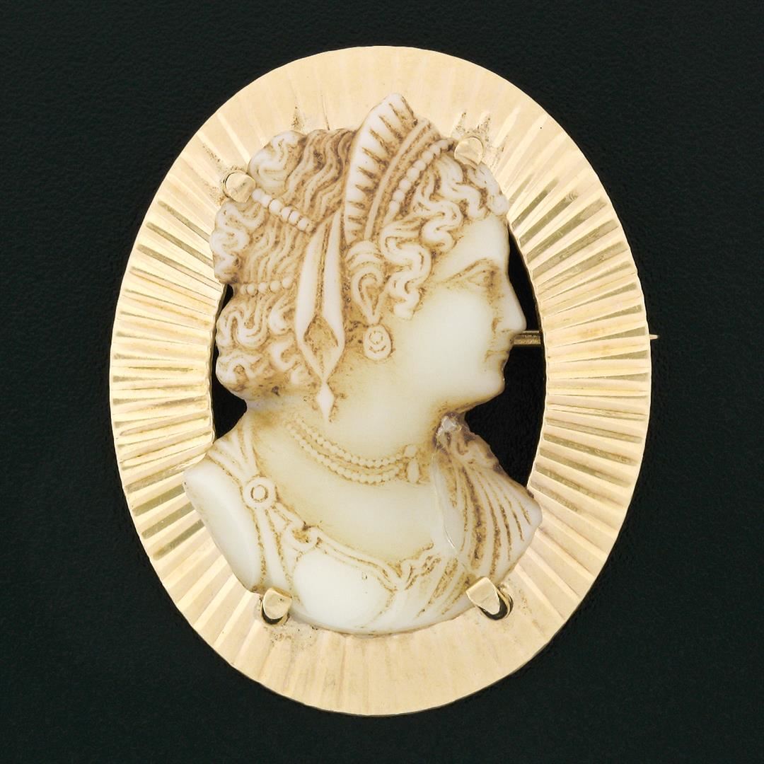 A retro vintage solid 14k rosy yellow gold fluted brooch with 1 white carved shell (29.75x19.4mm). Measures 37x29.9mm and weighs a total of 8.0 grams.