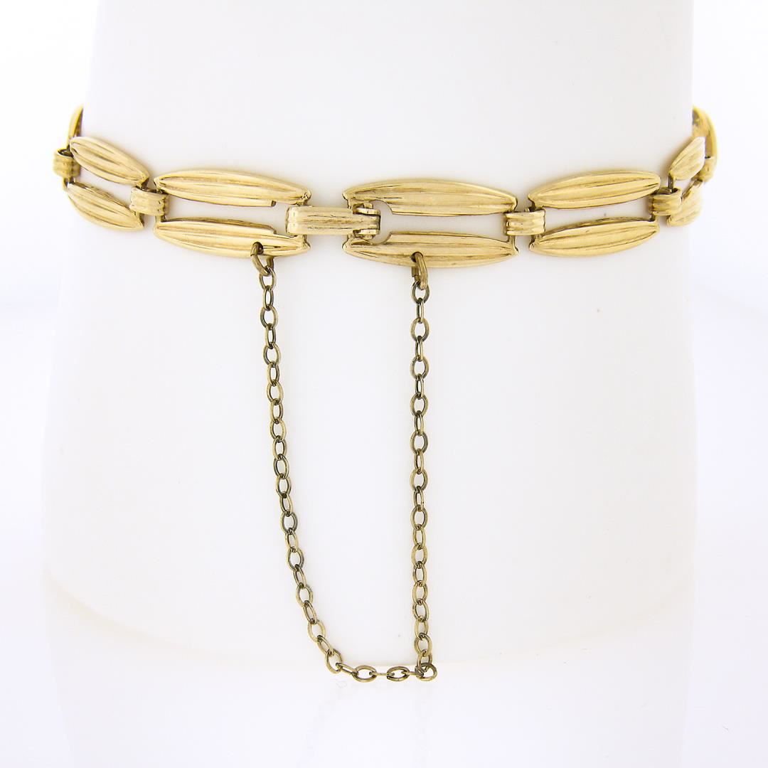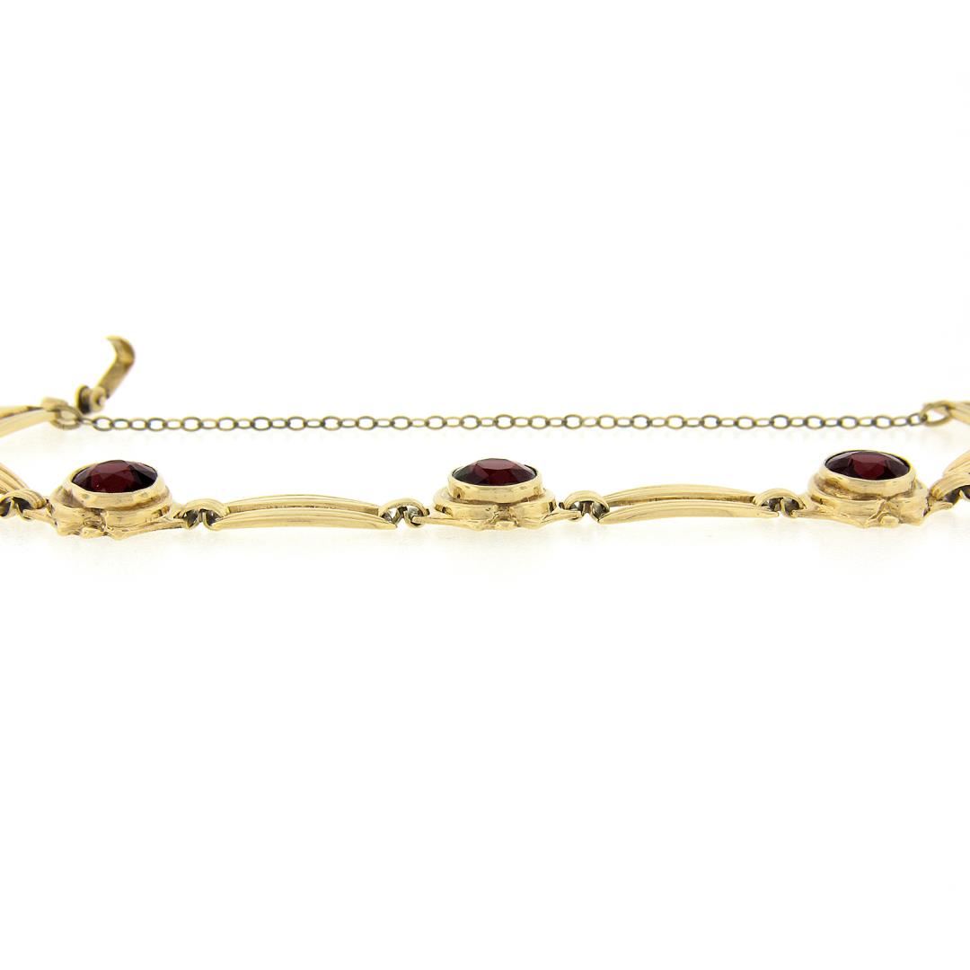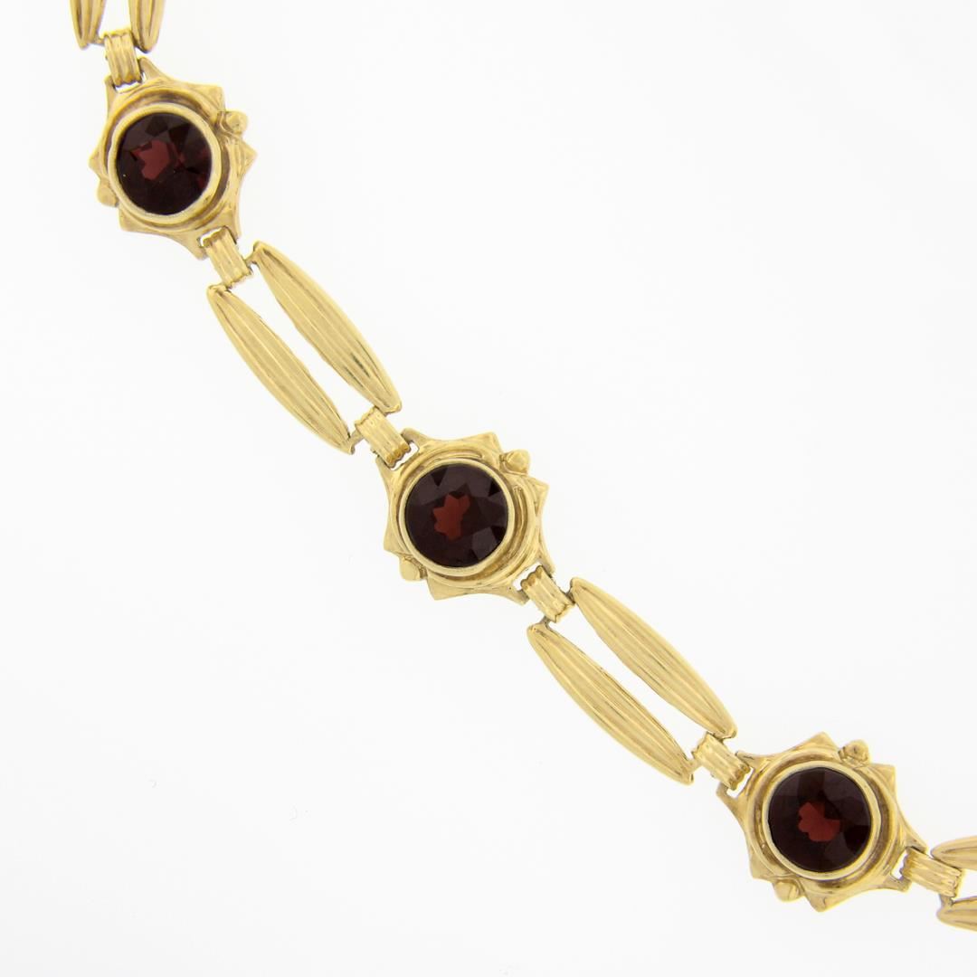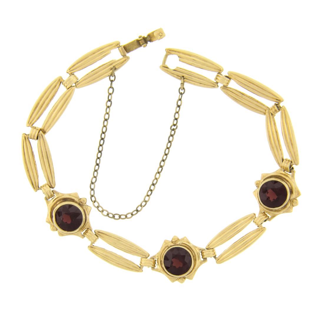 A vintage 14k yellow gold link bracelet, with 3 old round cut natural garnets (7mm - 4.8ctw). It weighs a total of 10.45 grams, measures 11.9mm wide, and measures 6.75 inches in length.