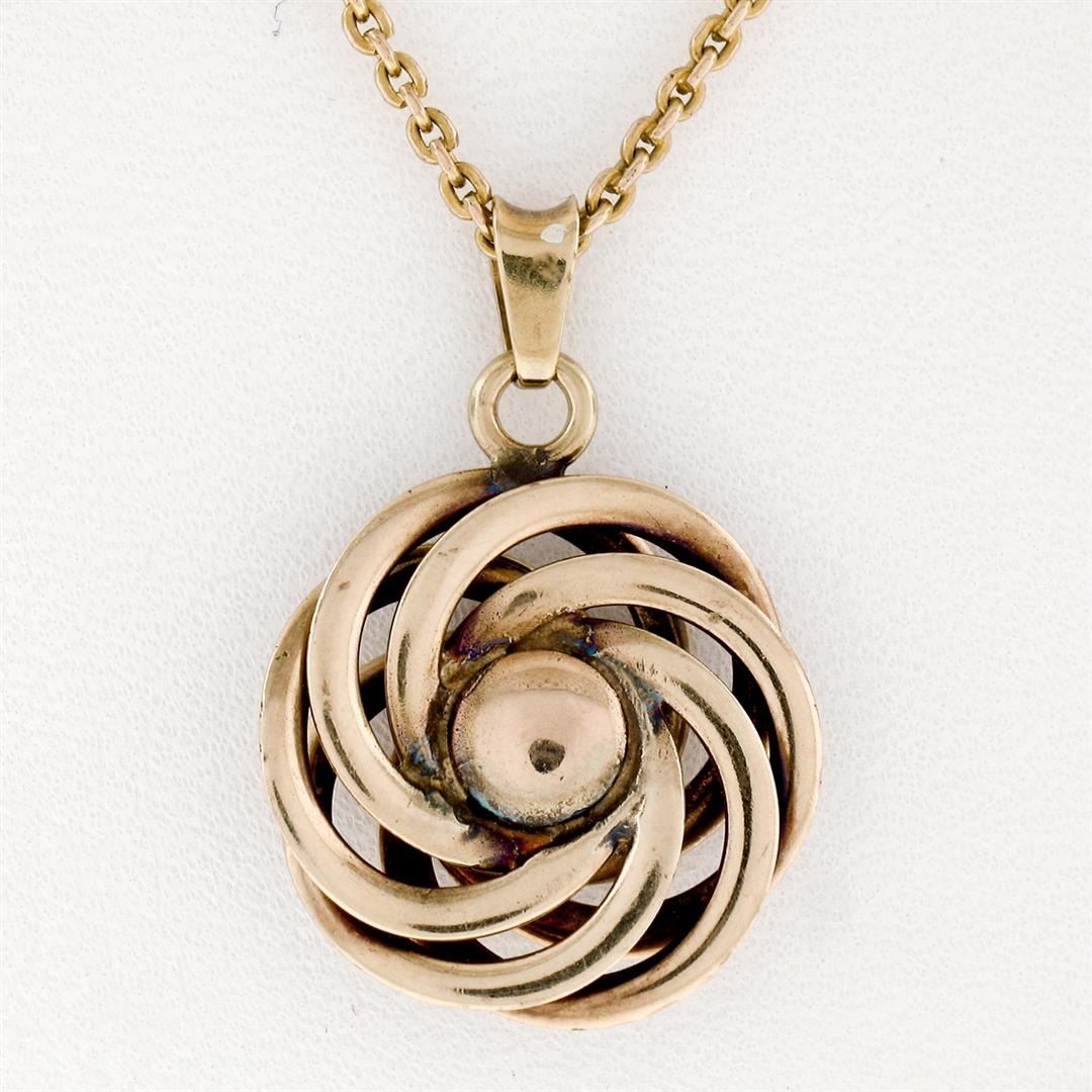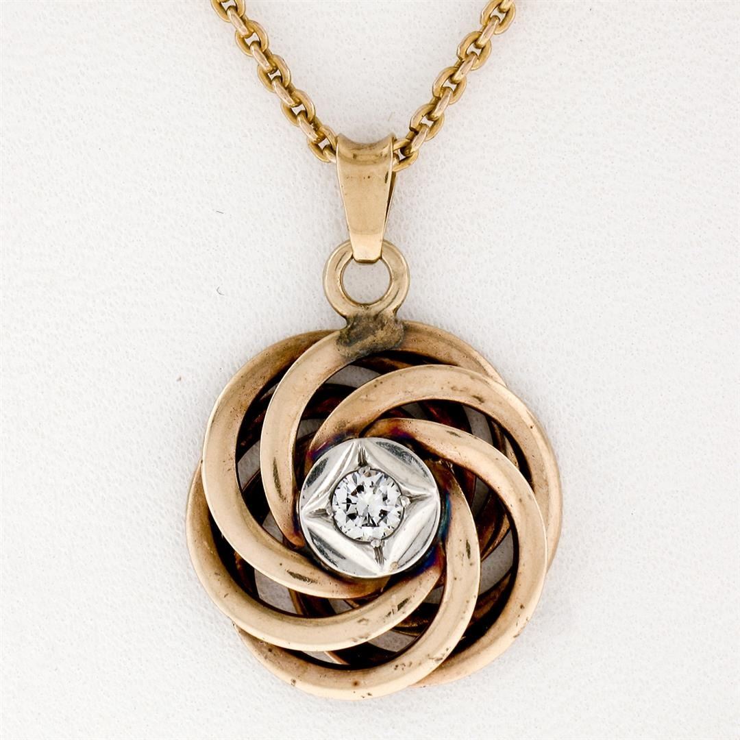 A vintage solid 14k rose, white and yellow gold love knot pendant necklace, with 1 round transitional cut natural diamond (F- VS2; 0.24ct). The pendant weighs a total of 6.70 grams, measures 26.0x17.65mm including the bail, and 16 inch cable link chain.
