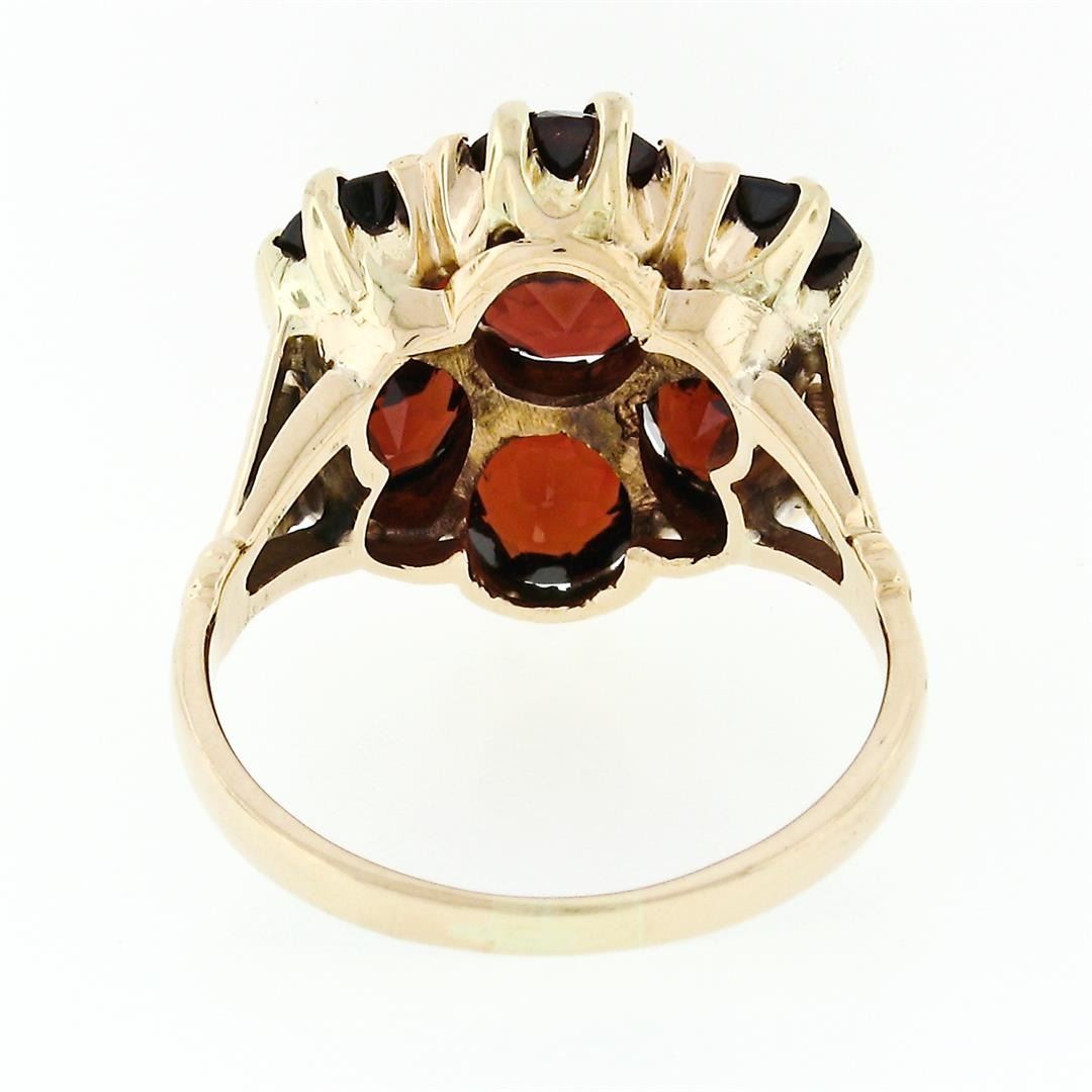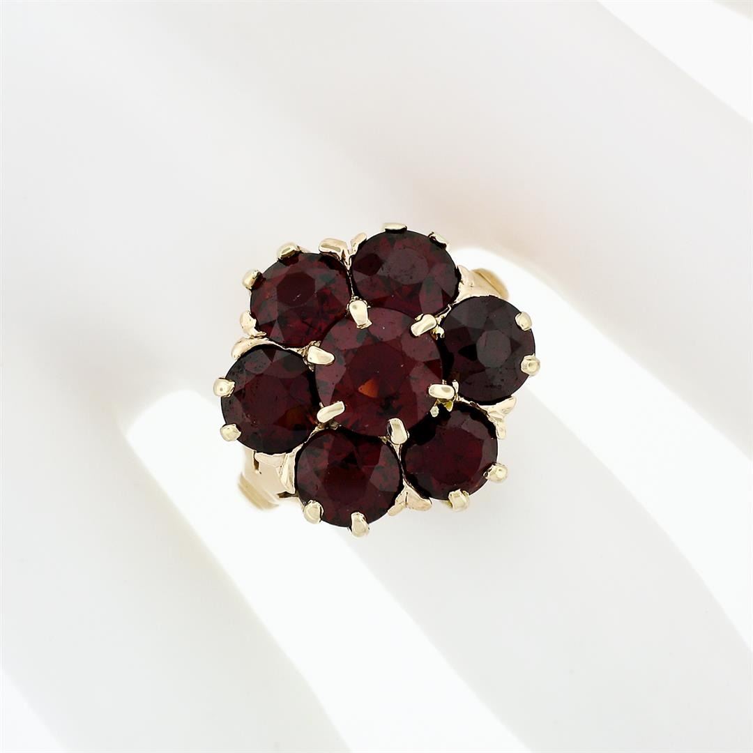 A vintage solid 14k yellow gold cluster flower ring, with 7 old round cut natural garnets (6mm to 7mm; 7.6ctw). The ring is size 7.0, weighs a total of 6.42 grams, and measures 18mm wide.