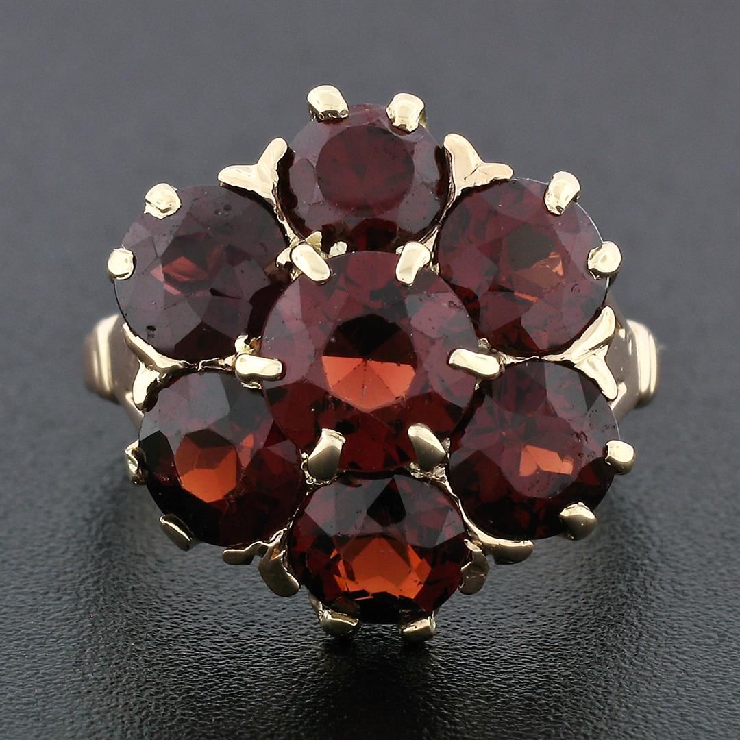 A vintage solid 14k yellow gold cluster flower ring, with 7 old round cut natural garnets (6mm to 7mm; 7.6ctw). The ring is size 7.0, weighs a total of 6.42 grams, and measures 18mm wide.