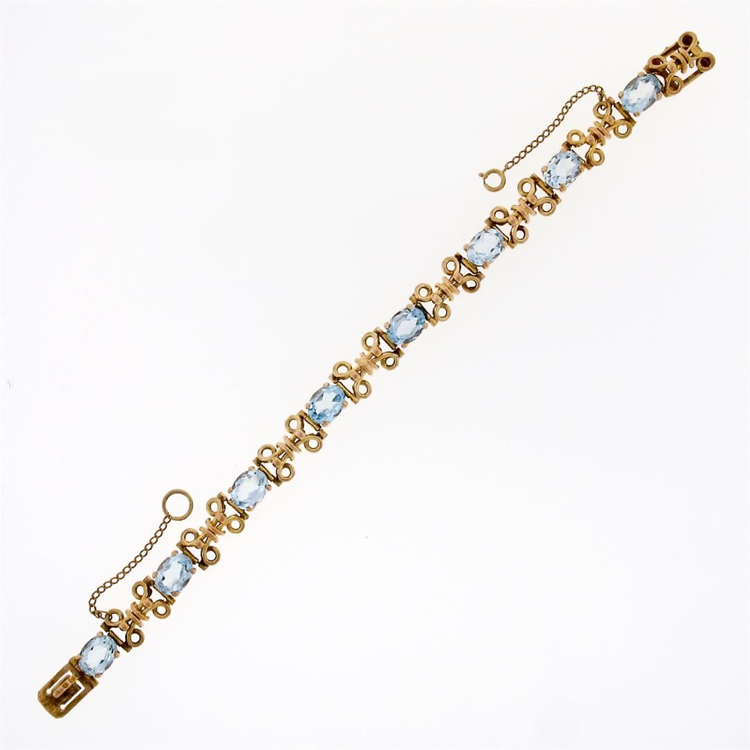 A vintage solid 18k yellow gold open link bracelet, with 8 oval cut natural aquamarine (8.0x6.0mm- 9.00ctw). It weighs a total of 17.88 grams, measures 8.70mm wide, and measures 6.5 inches in length.