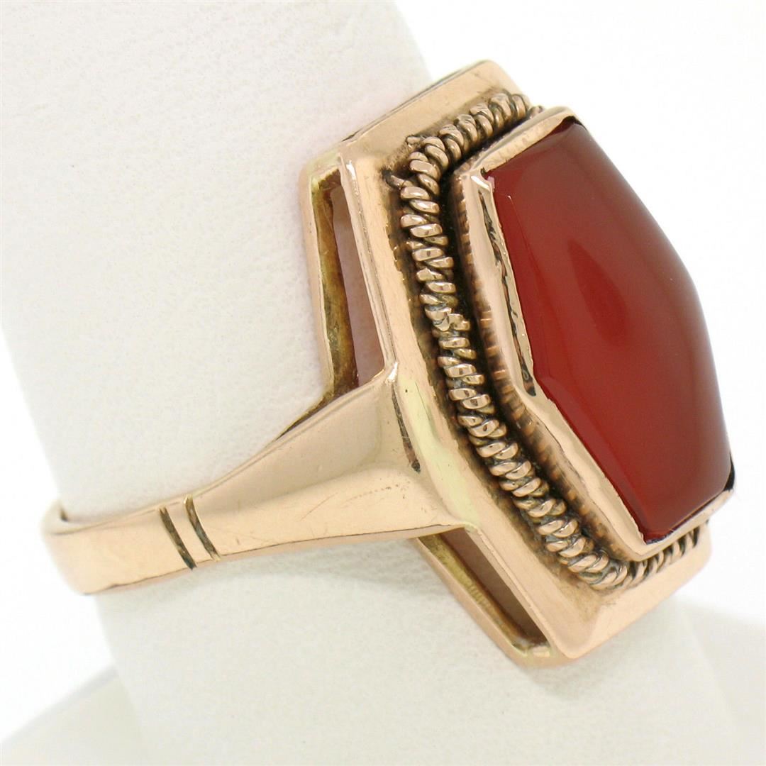 An excellent condition, vintage, Russian-made ring bezel set with a hexagonal cabochon cut carnelian measuring 14.0x9.25mm. The ring is a size 9, weighs a total of 7.10 grams, and is 20.15mm wide.