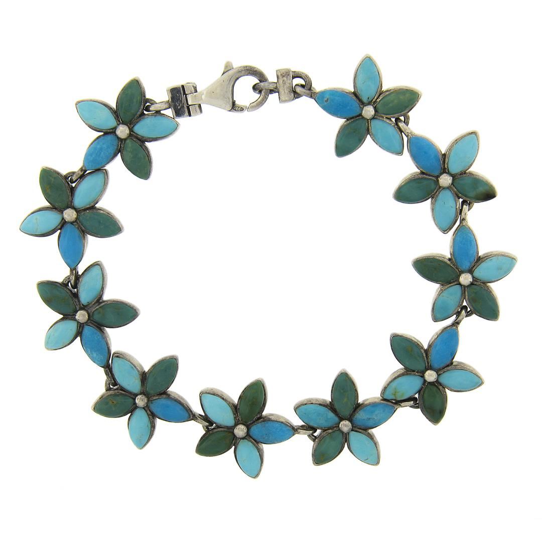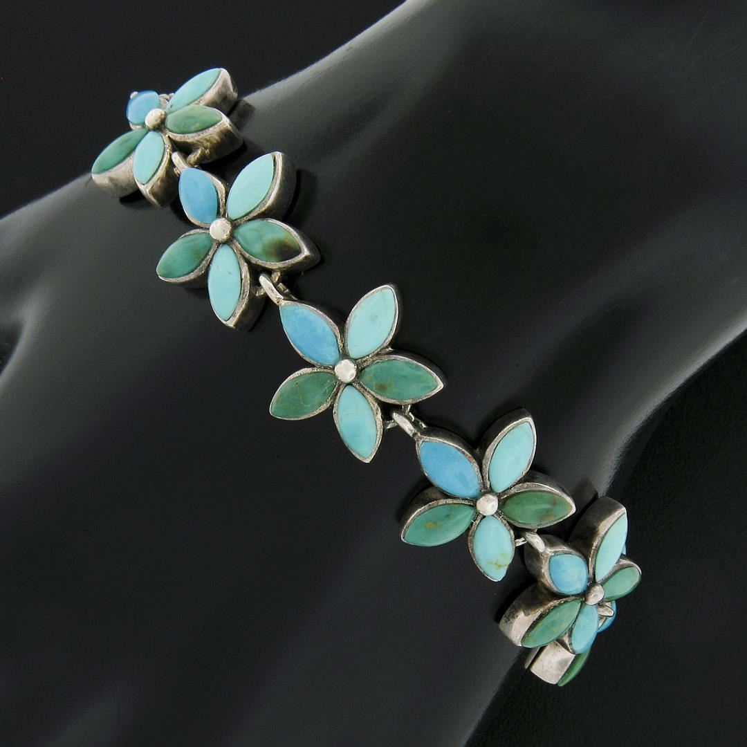 A vintage solid silver floral bracelet, featuring 50 marquise shape natural turquoise. It weighs a total of 31.94 grams, measures 16.1mm wide, and measures 7 inches in length.