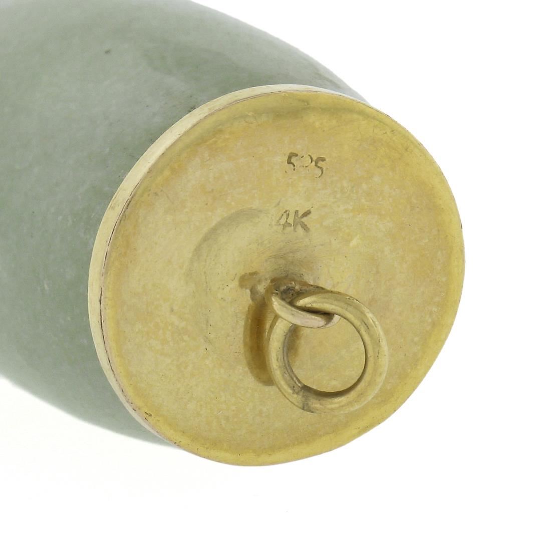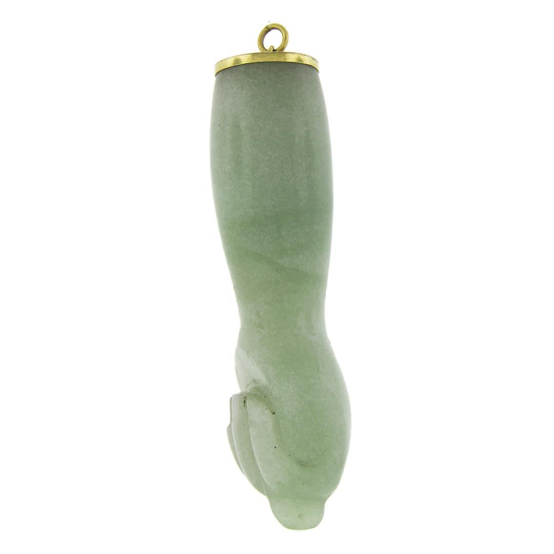 A vintage solid 14k yellow gold hand figa pendant, with 1 hand shaped natural jade (74.6x24.4 mm).The pendant weighs a total of 51.14 grams, measures 80x24.4mm including the bail, and the inside of the bail measures 2.9x3.4mm.