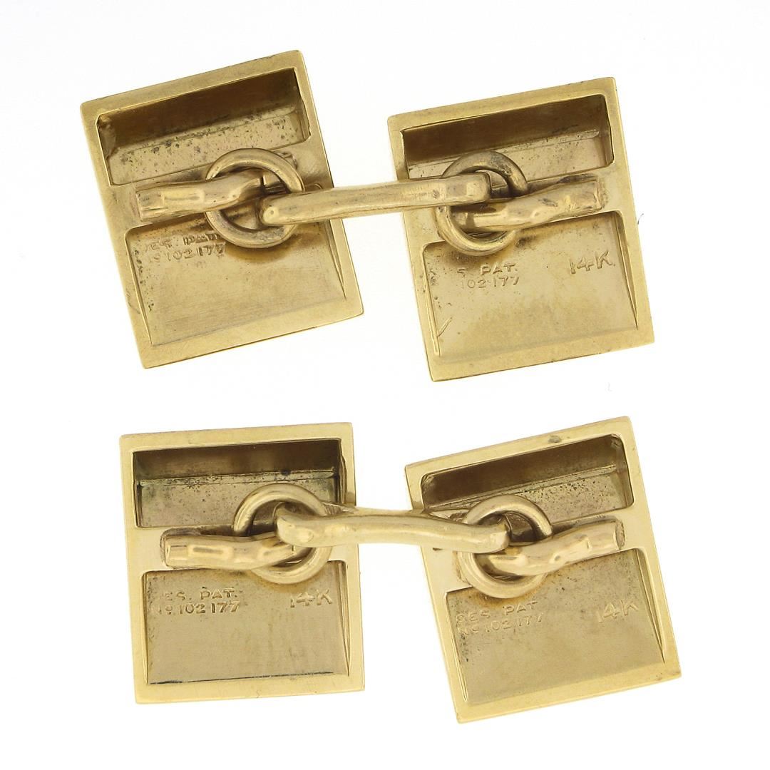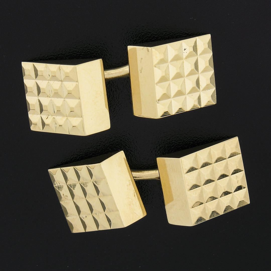 A vintage soldi 14k yellow gold pyramid cufflinks. These cuff links have a chain design with a clearance of 16.8mm, weigh a total of 9.13 grams, and the front panels measure 10.9x13.2mm.