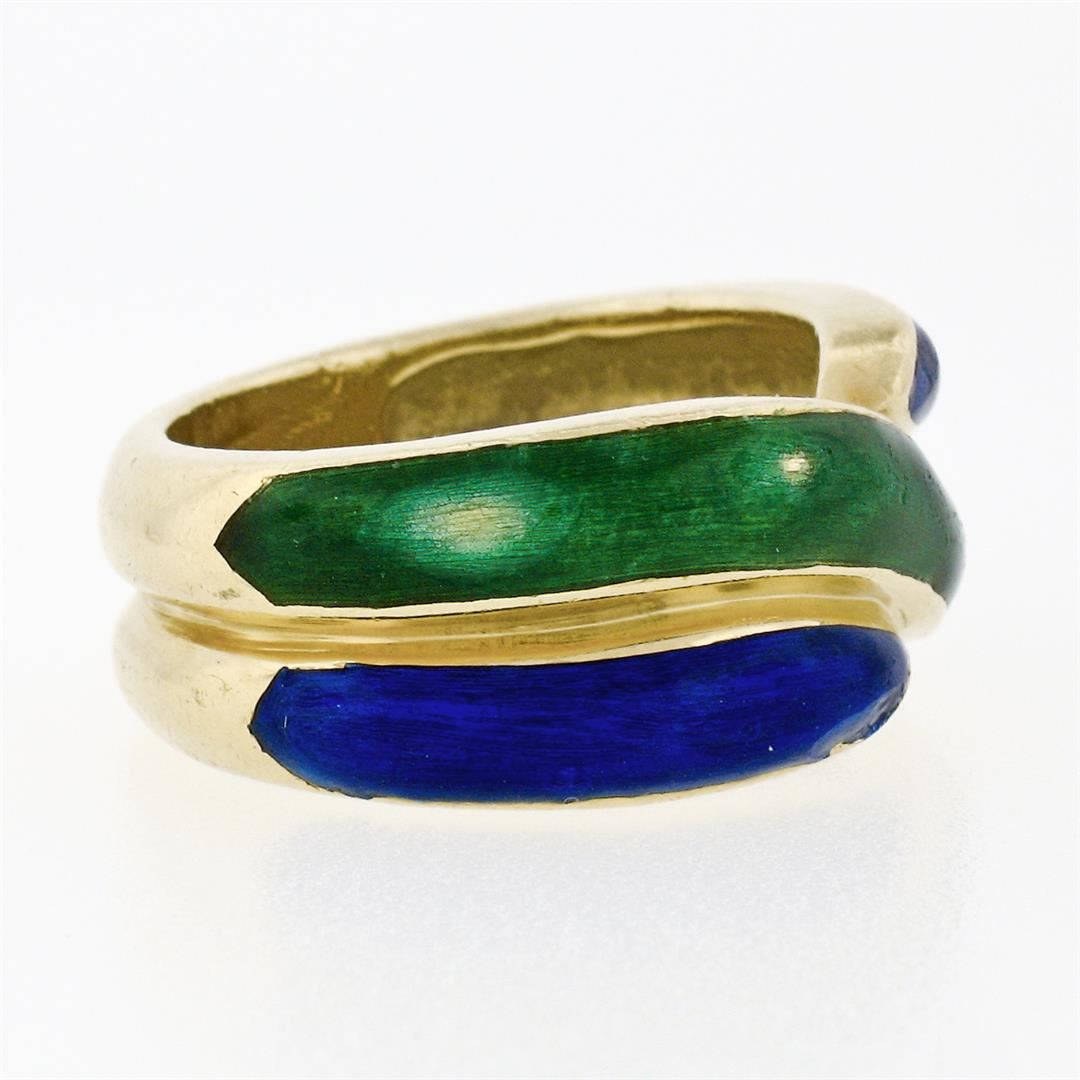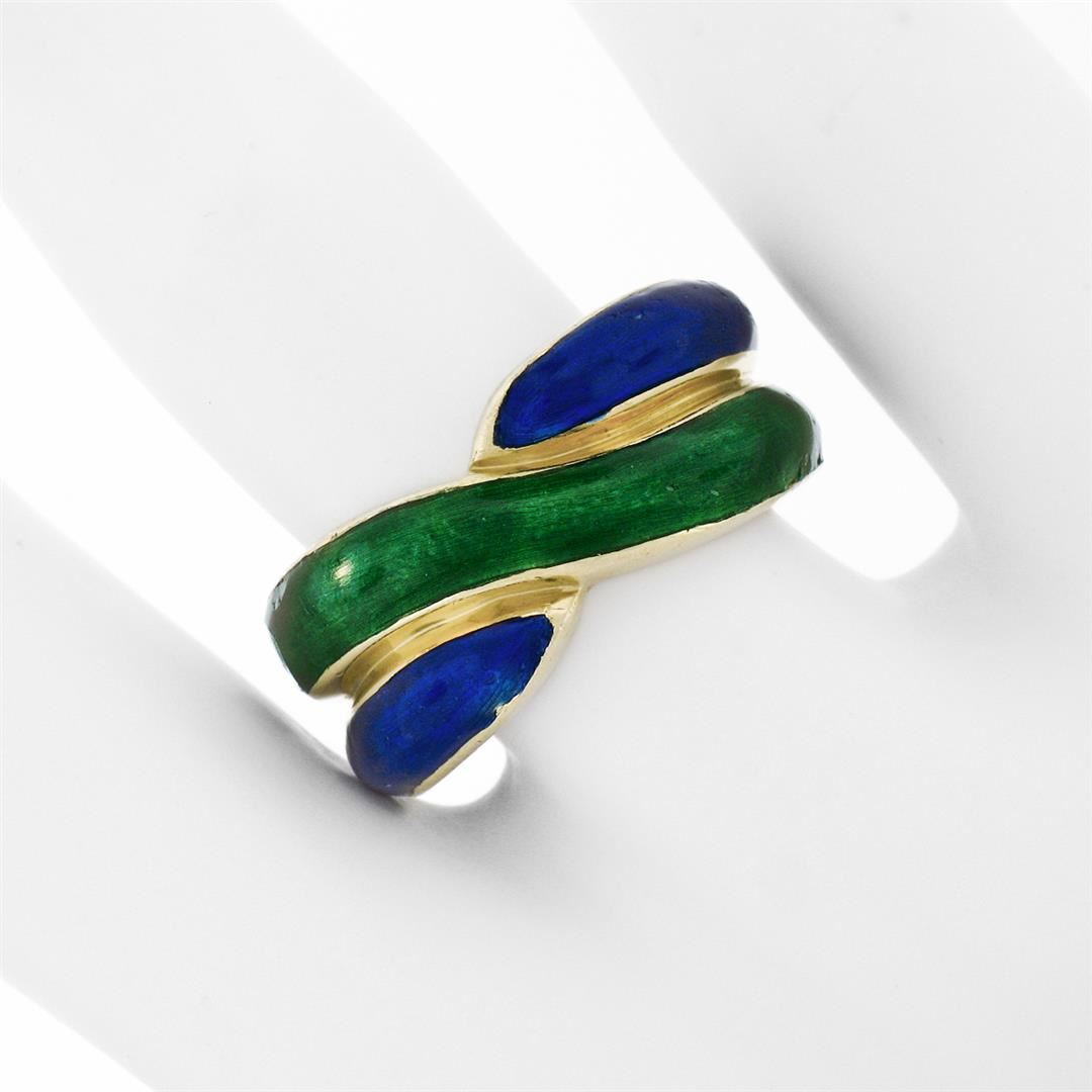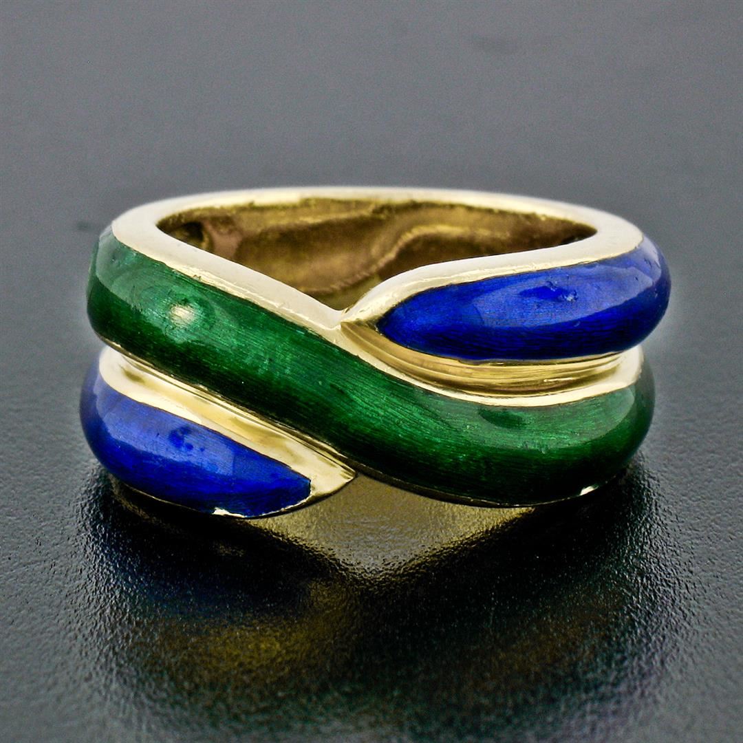 A vintage solid 18k yellow gold intertwined band ring. with blue and green enamel. The ring is size 6.0, weighs a total of 15.01 grams, and measures 9.90mm wide.