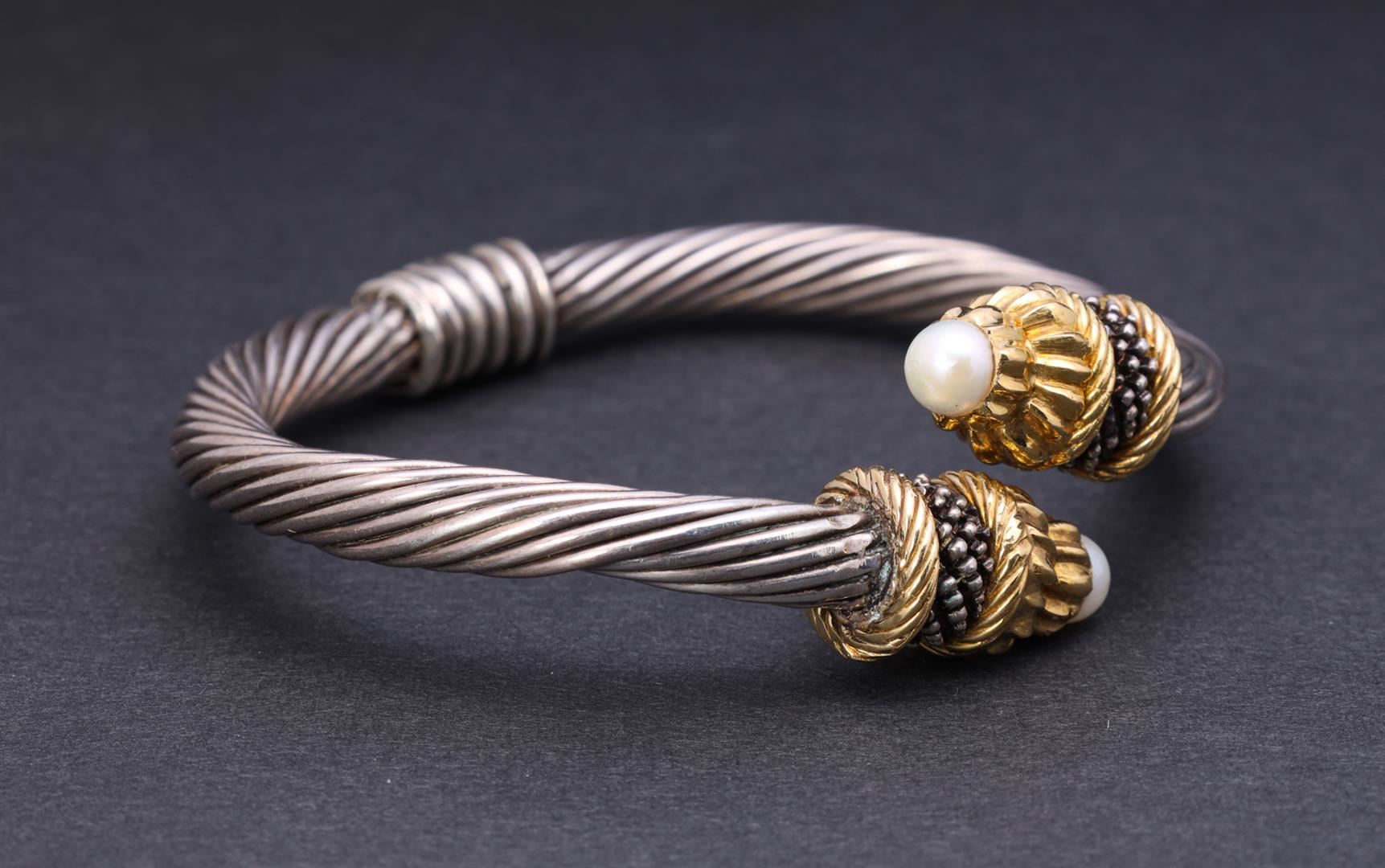 Vintage Sterling Silver & 18K Gold Crossover Bracelet with Natural Pearls. Total weight is 36 gm. Estimated retail value $1,200.