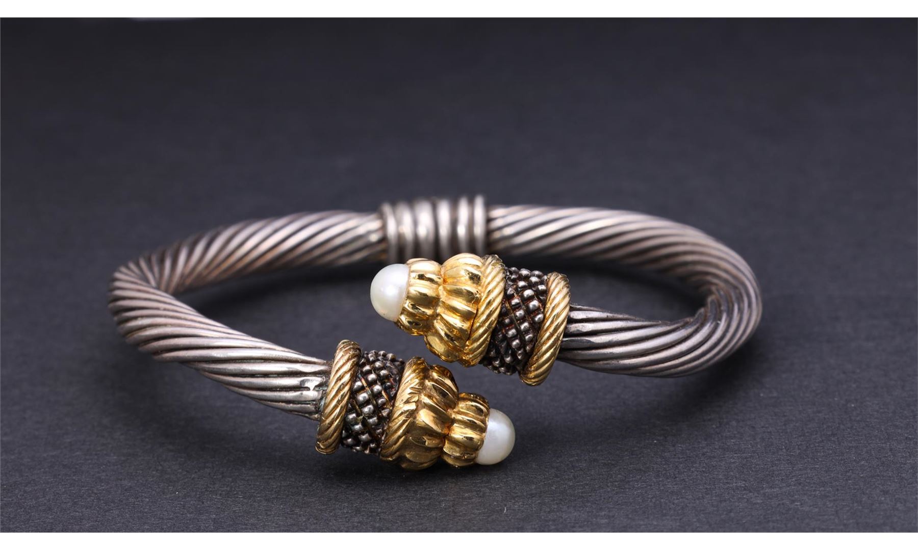 Vintage Sterling Silver & 18K Gold Crossover Bracelet with Natural Pearls. Total weight is 36 gm. Estimated retail value $1,200.