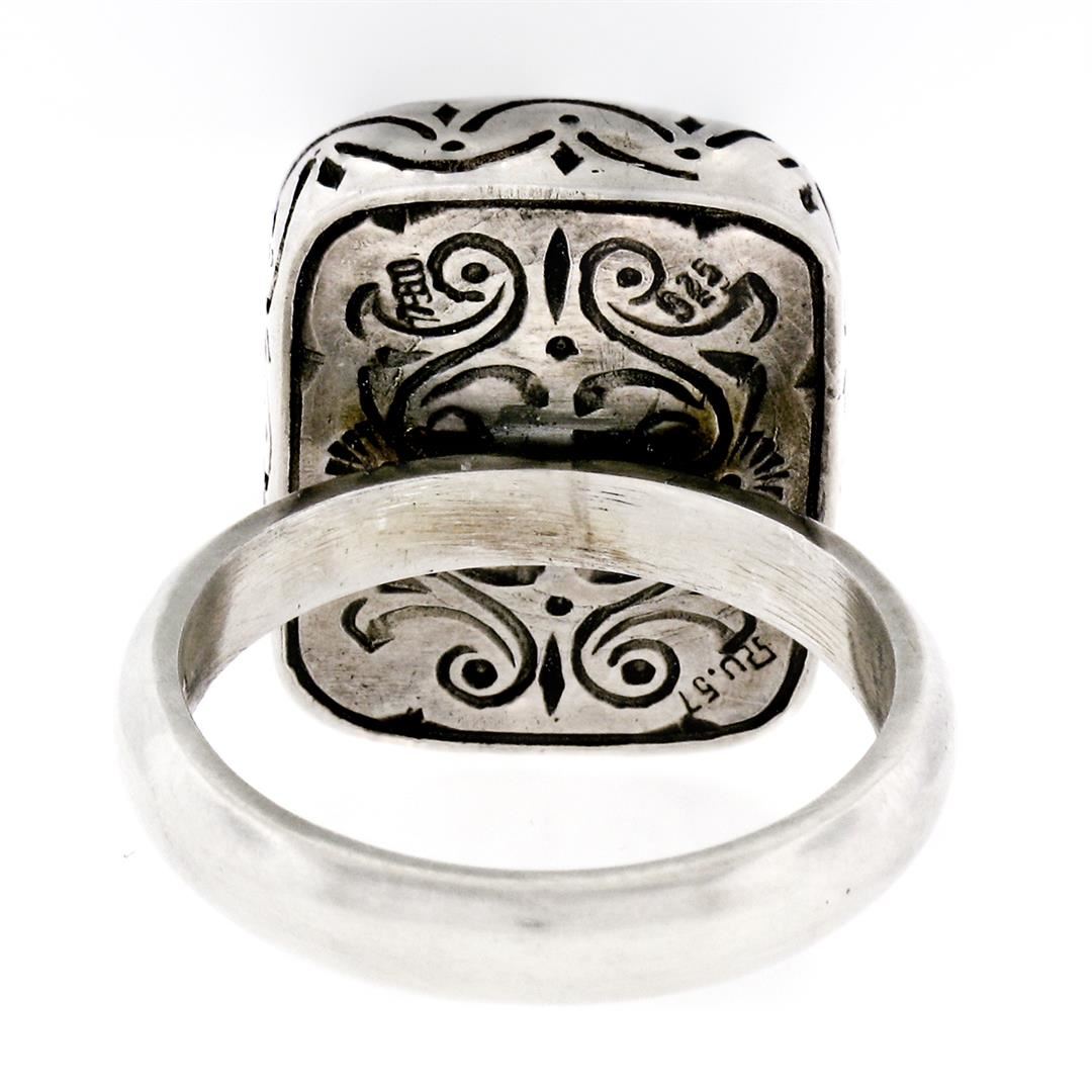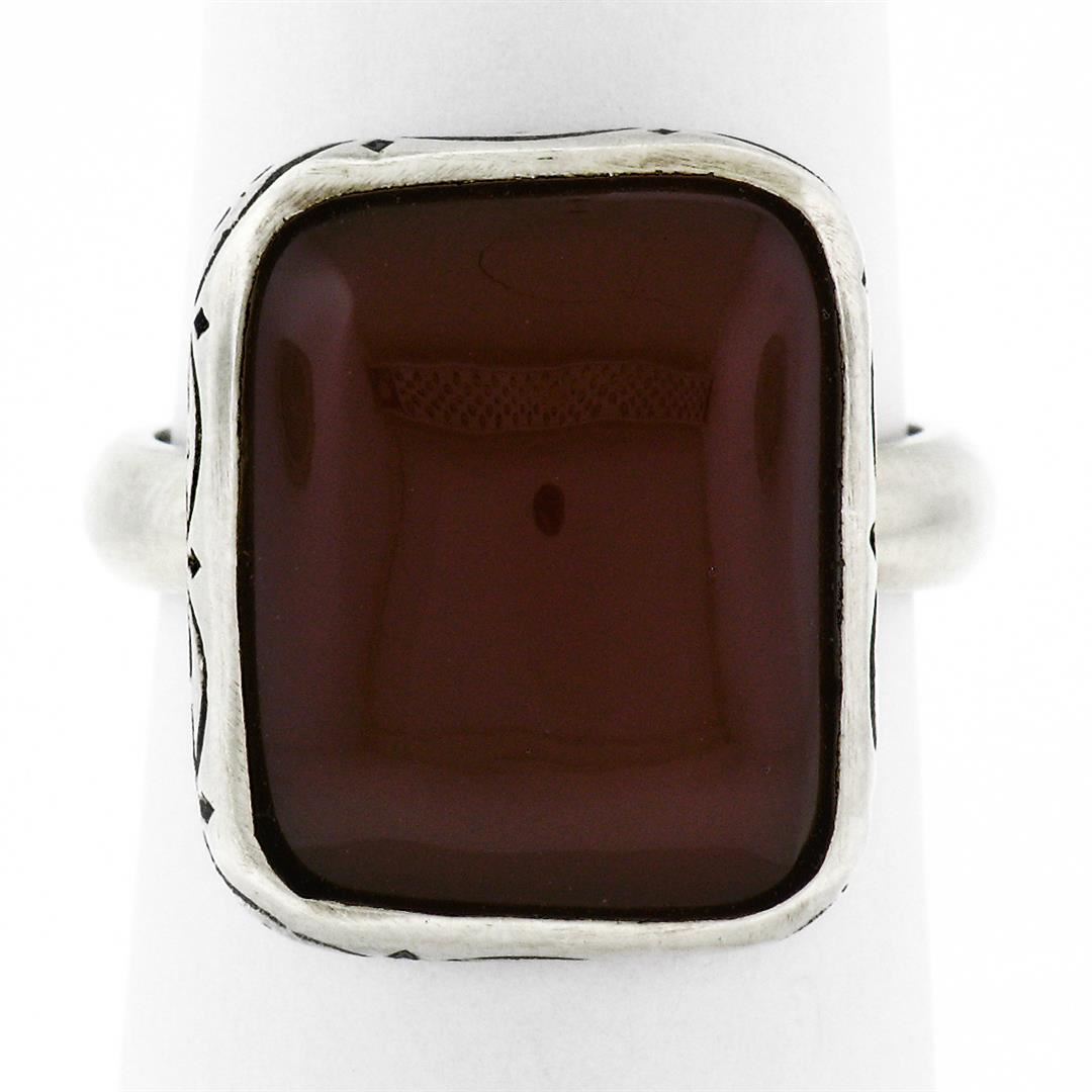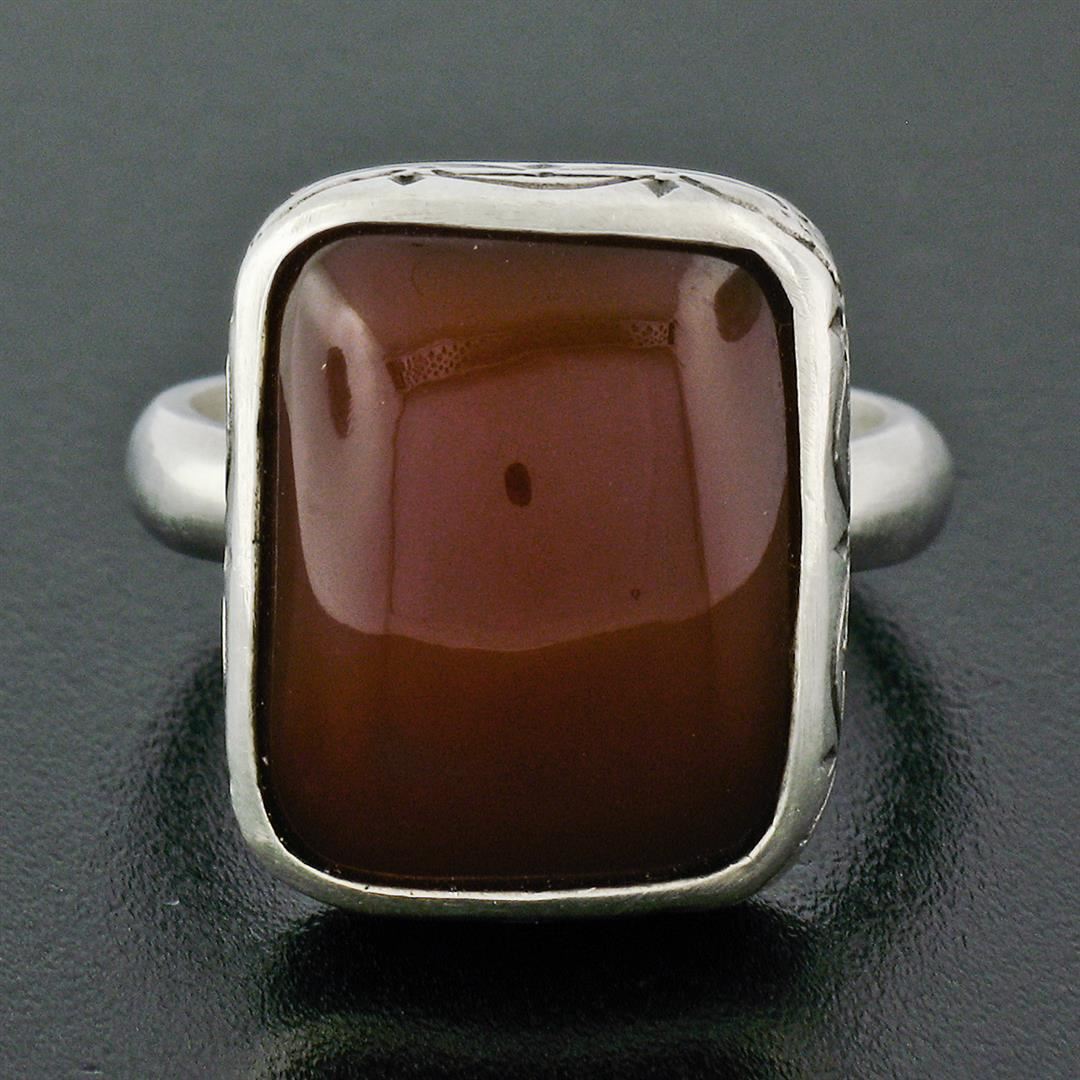 A vintage sterling silver ring featuring a cushion cabochon cut carnelian bezel set above an engraved basket. The ring is size 6.5, weighs a total of 7.63 grams, and measures 17.5mm wide.