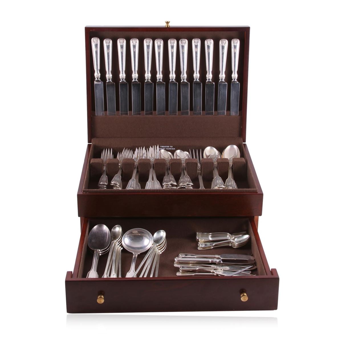 This is a Vintage Sterling Silver flatware set of 101 pieces by Tiffany & Co in the Shell & Thread pattern. This set consists of 12 Blunt Hollow Knives with TIFFANY blades, 9 1/8 inch- 9 Forks, 7 inch - 12 Salad Forks, 6 3/4 inch - 14 Teaspoons, 5 7/8 inch - 12 Place Oval Soup Spoons, 7 1/8 inch - 12 Flat Handle Butter Spreaders, 5 3/4 inch - 11 Iced Tea Spoons, 7 1/2 inch - 12 Demitasse Spoons, 4 1/8 inch - 3 Serving Tablespoons, 8 5/8 inch - 1 Gravy Ladle, 7 1/4 inch - 1 Blunt Hollow Butter Knife, 6 inch - 1 Cold Meat Serving Fork, 9 inch - 1 Roast Carving Fork, 11 inch. Includes new Mahogany storage chest. Monogrammed in lovely period script. This flatware set is in very good estate condition.