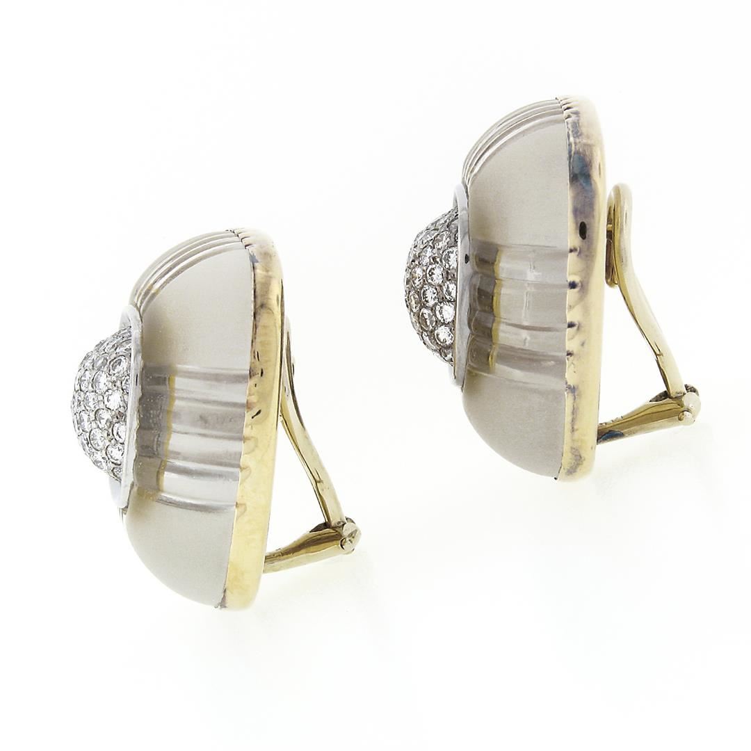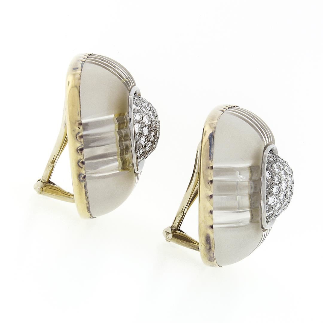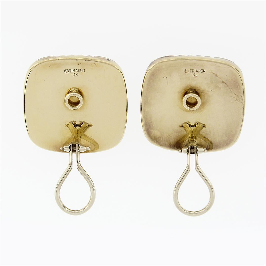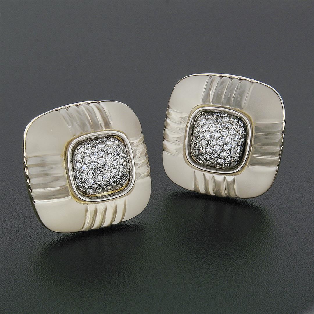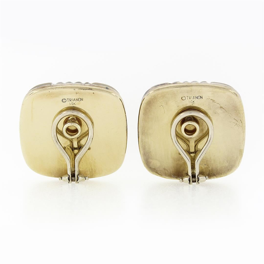 A vintage solid 14k yellow & white gold earrings by Trianon, with 1 square cushion cut natural quartz (23.5mm ), and 128 round brilliant cut natural diamonds (F/G - VVS2 ; 2.24ctw). The earrings measure approximately 24.66x24.60mm and weigh a total of 27.26 grams.