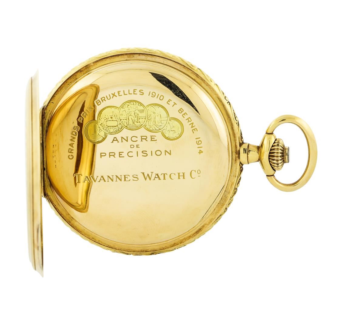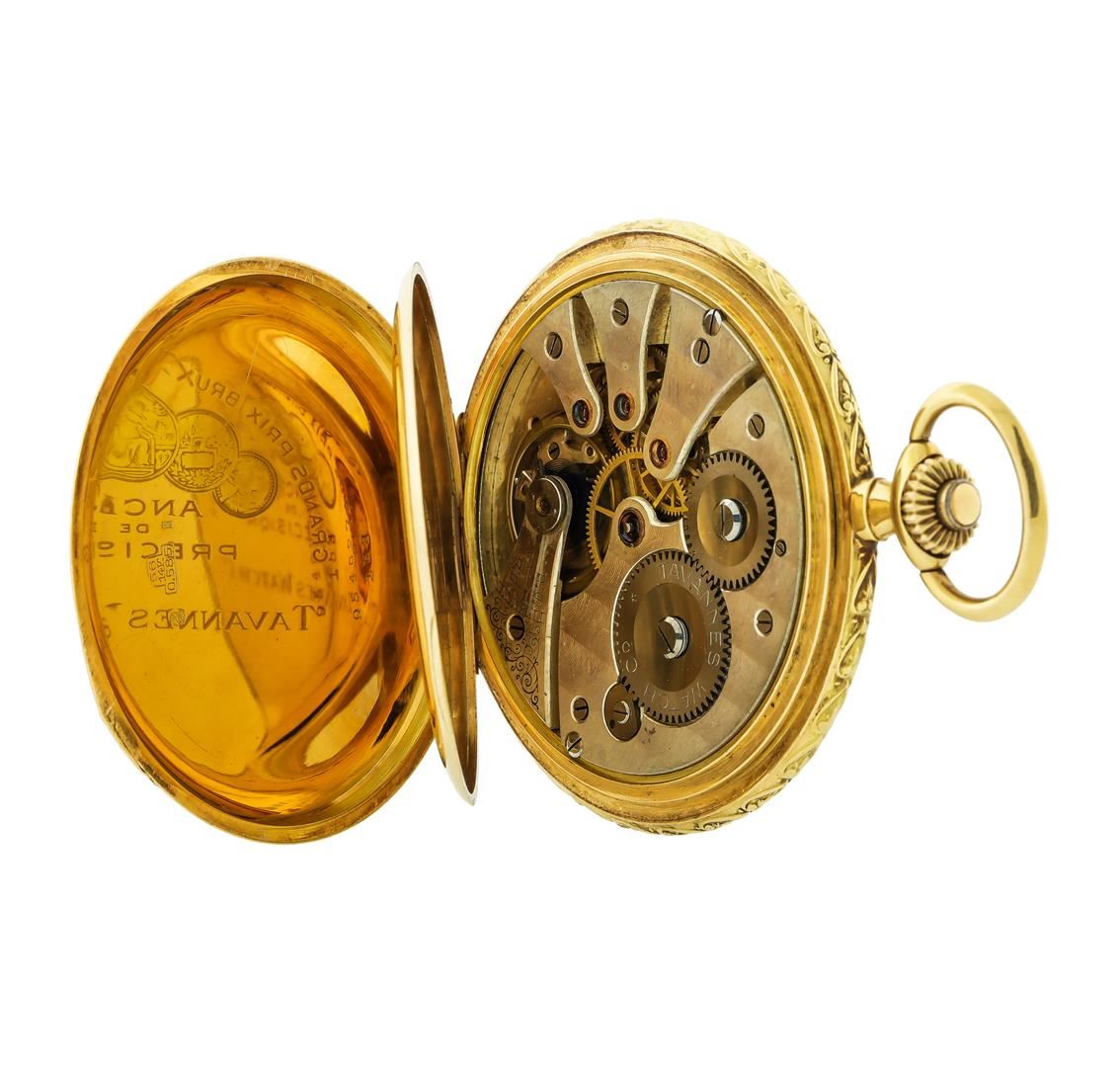 One Tavannes vintage 14KT Yellow Gold Pocketwatch. Movement: Tavannes, mechanical with manual winding. Case: Hunter, 14KT Yellow Gold engraved, measures 50mm in diameter, case number 9549374. Case signed "14K 0.585". Dial: White enamel with painted Arabic numerals and blued steel hands. Seconds sub-dial is located at 6 o'clock. Condition: G-4 FINE, (good working order and good condition). Total Weight of Watch: 70.00gm