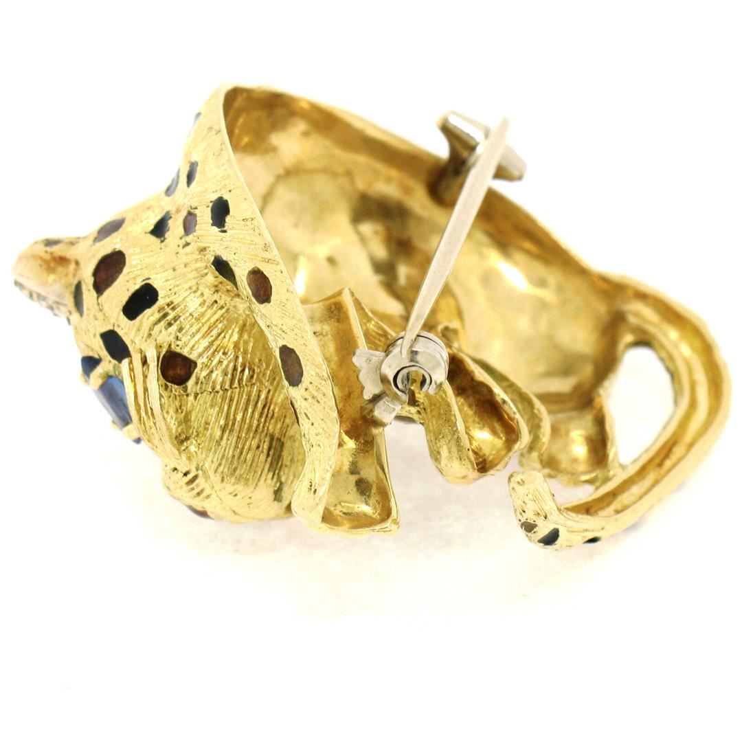 A vintage solid 18k yellow gold and enamel leopard brooch, featuring 2 marquise cut natural sapphires (0.60ctw), and 6 round single cut natural diamonds (G - VS2; 0.06ctw). Measures 40.70x37.10mm and weighs a total of 21.66 grams.