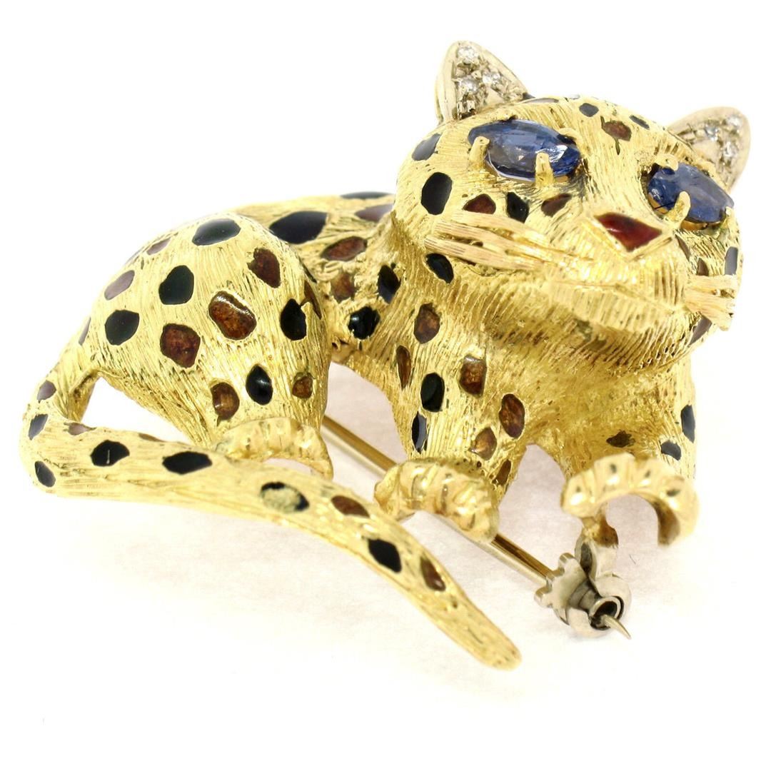 A vintage solid 18k yellow gold and enamel leopard brooch, featuring 2 marquise cut natural sapphires (0.60ctw), and 6 round single cut natural diamonds (G - VS2; 0.06ctw). Measures 40.70x37.10mm and weighs a total of 21.66 grams.