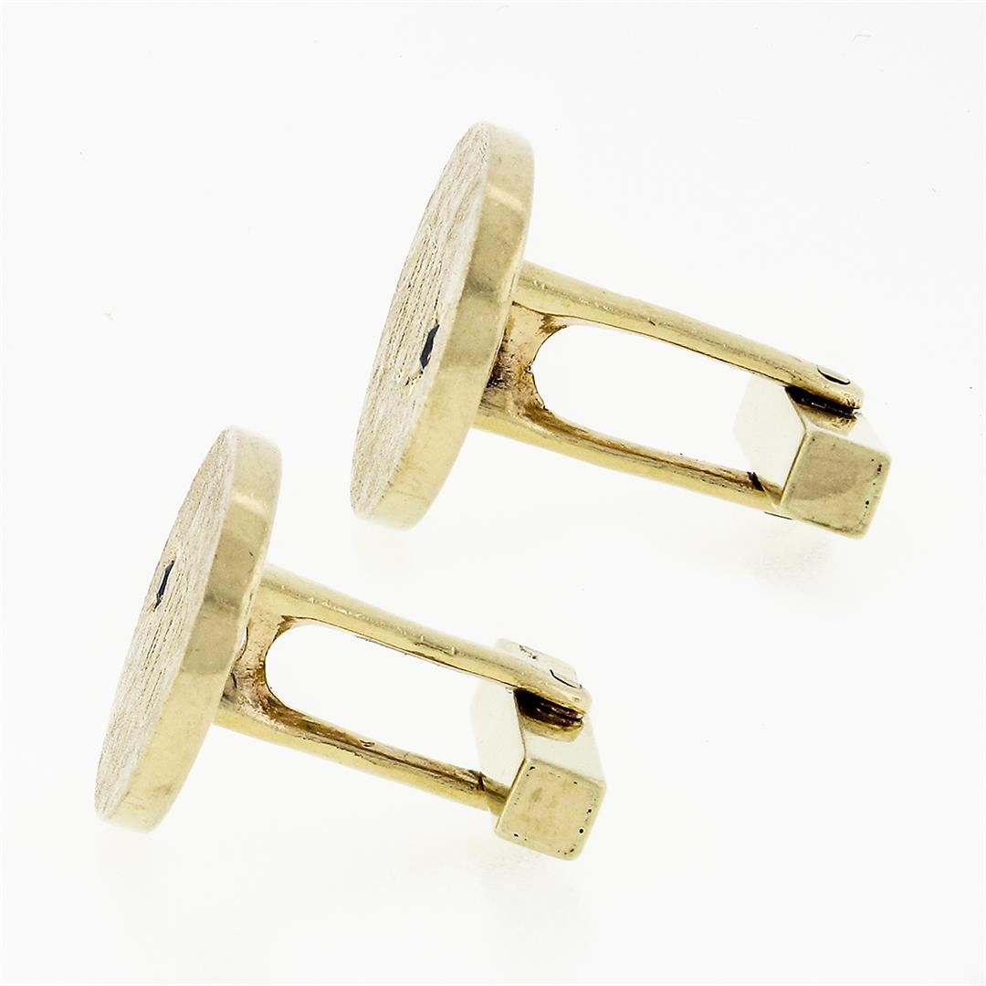 A vintage solid 14k yellow gold cufflinks by Tiffany & Co. , with 2 round brilliant cut natural sapphires (0.06ctw). These cuff links have a swivel design with a clearance of 13mm, weigh a total of 23.66 grams, and the front panels measure 21.9x17.2mm.