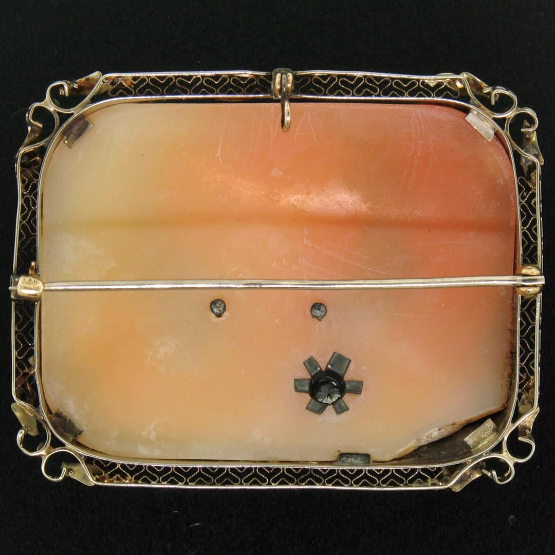A vintage pendant or brooch featuring a rectangular genuine carved shell cameo (44.70x34.25mm) bezel set in a solid 14k white gold frame accented with an old European cut natural diamond (G-VS1; 0.12ct). Measures 39.20x49.85mm and weighs a total of 16.89 grams.