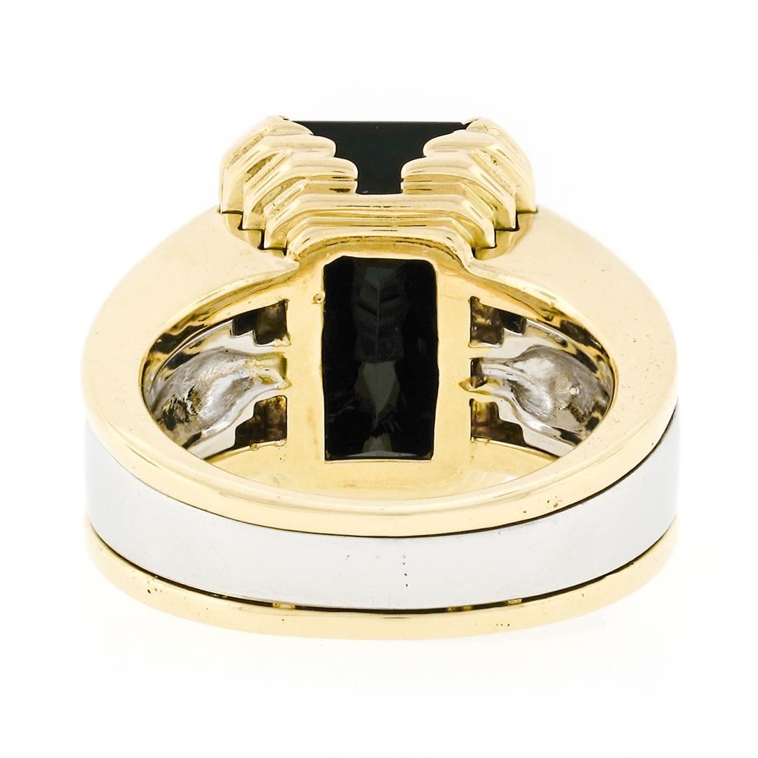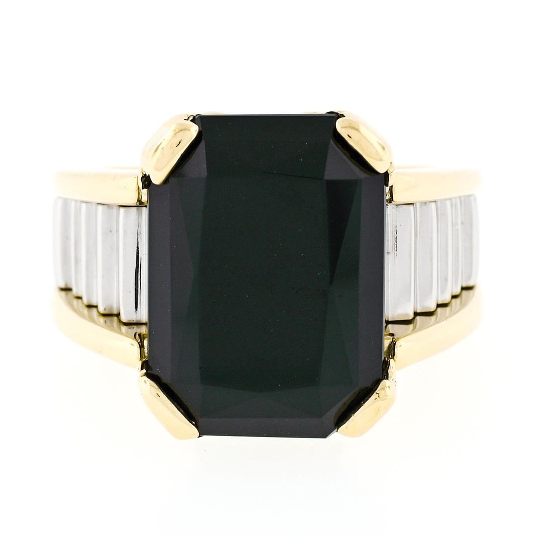 A vintage solid 18k yellow gold & platinum cocktail ring, with 1 rectan gular cut natural black onyx (17.75x12.95mm). The ring is size 9, weighs a total of 26.19 grams, and measures 18mm wide.