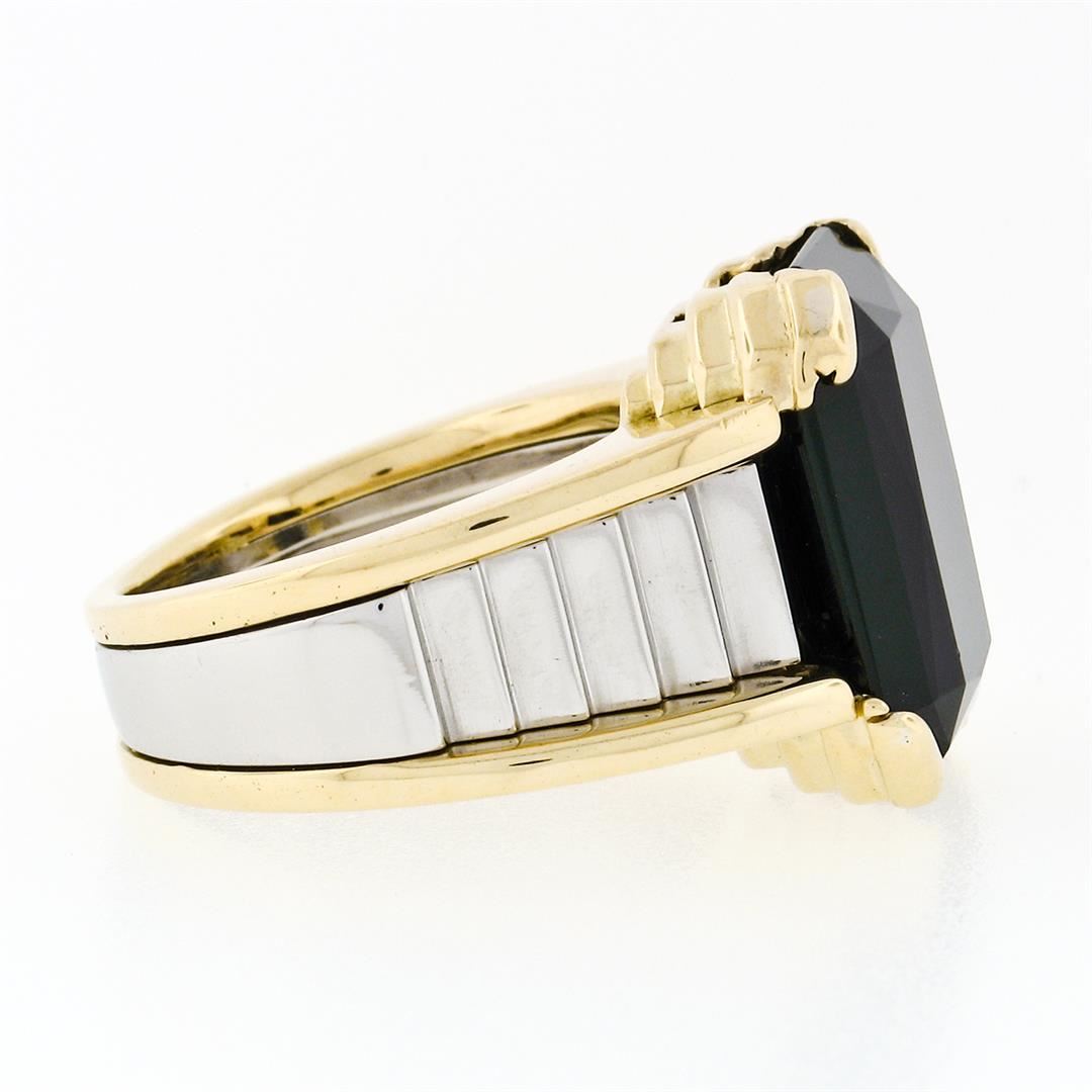 A vintage solid 18k yellow gold & platinum cocktail ring, with 1 rectan gular cut natural black onyx (17.75x12.95mm). The ring is size 9, weighs a total of 26.19 grams, and measures 18mm wide.