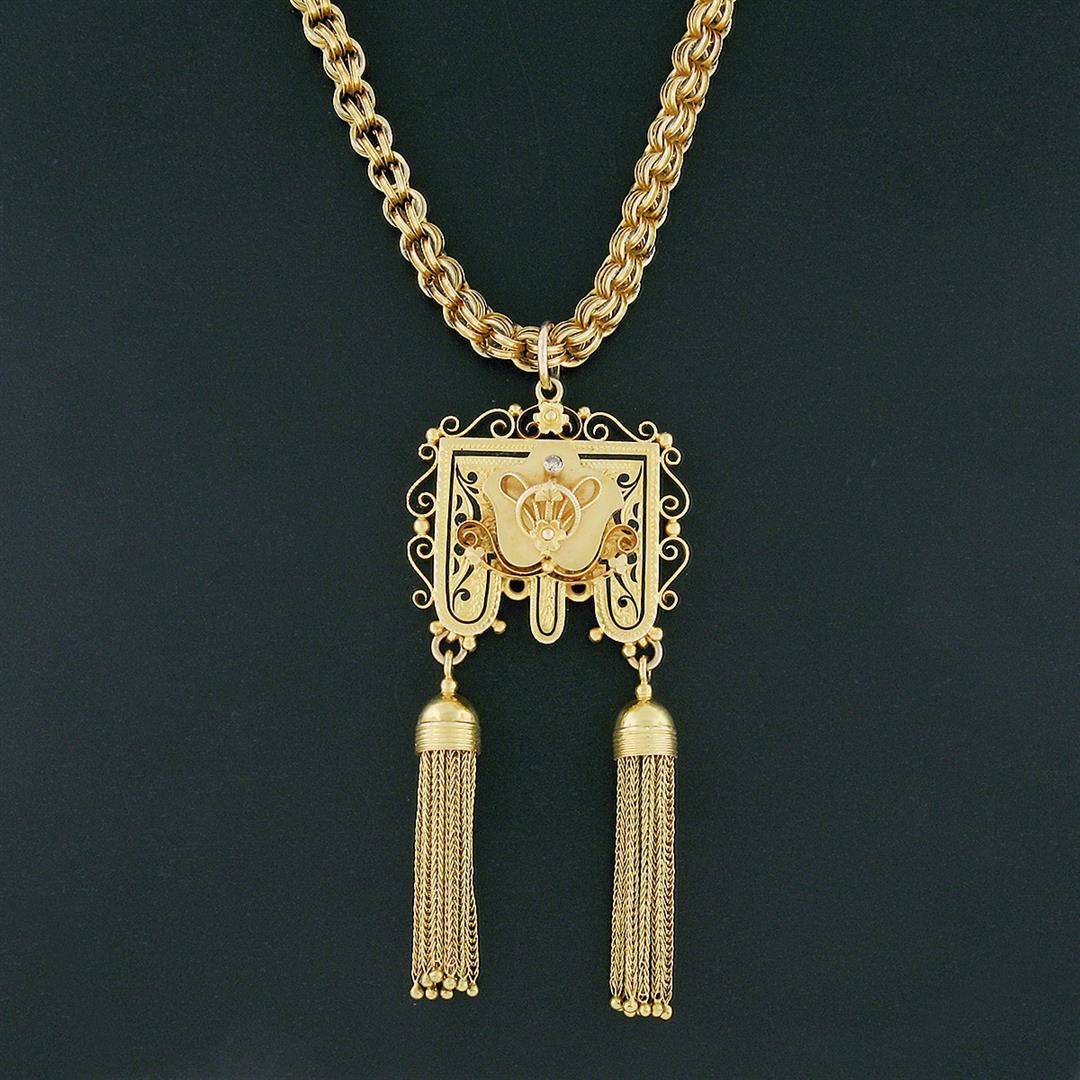 A solid 14k yellow gold tassel pendant necklace, with enamel work & 1 old single cut natural diamond (G - VS2 ; 0.05ct). 24.5 inch fancy interlocking dual circle link chain, 47.11 grams total weight, pendant measures 83.80x34.15mm.
