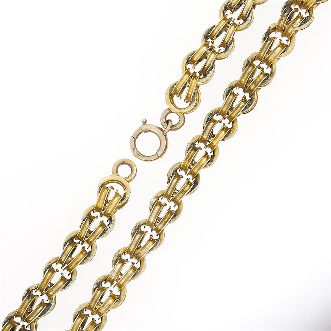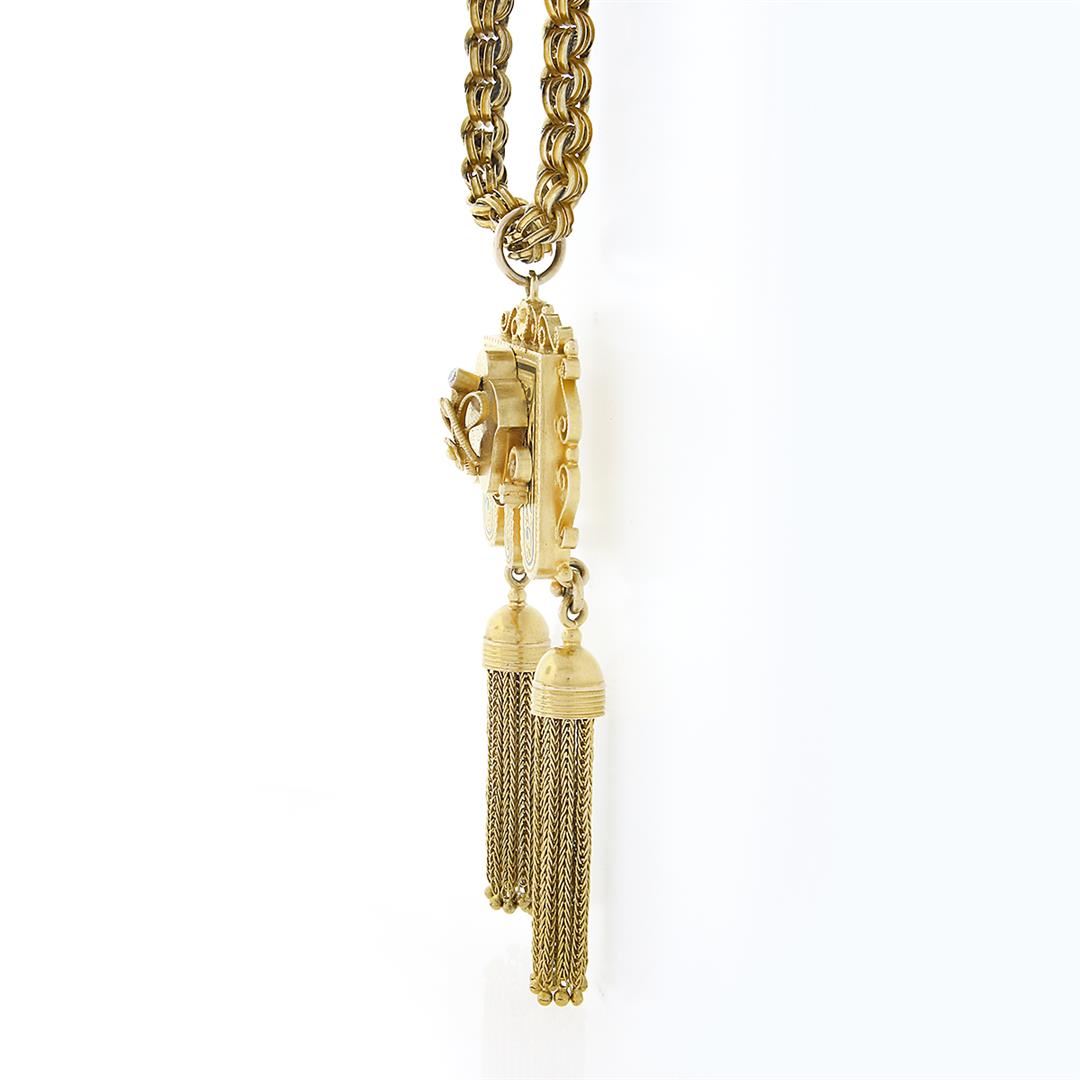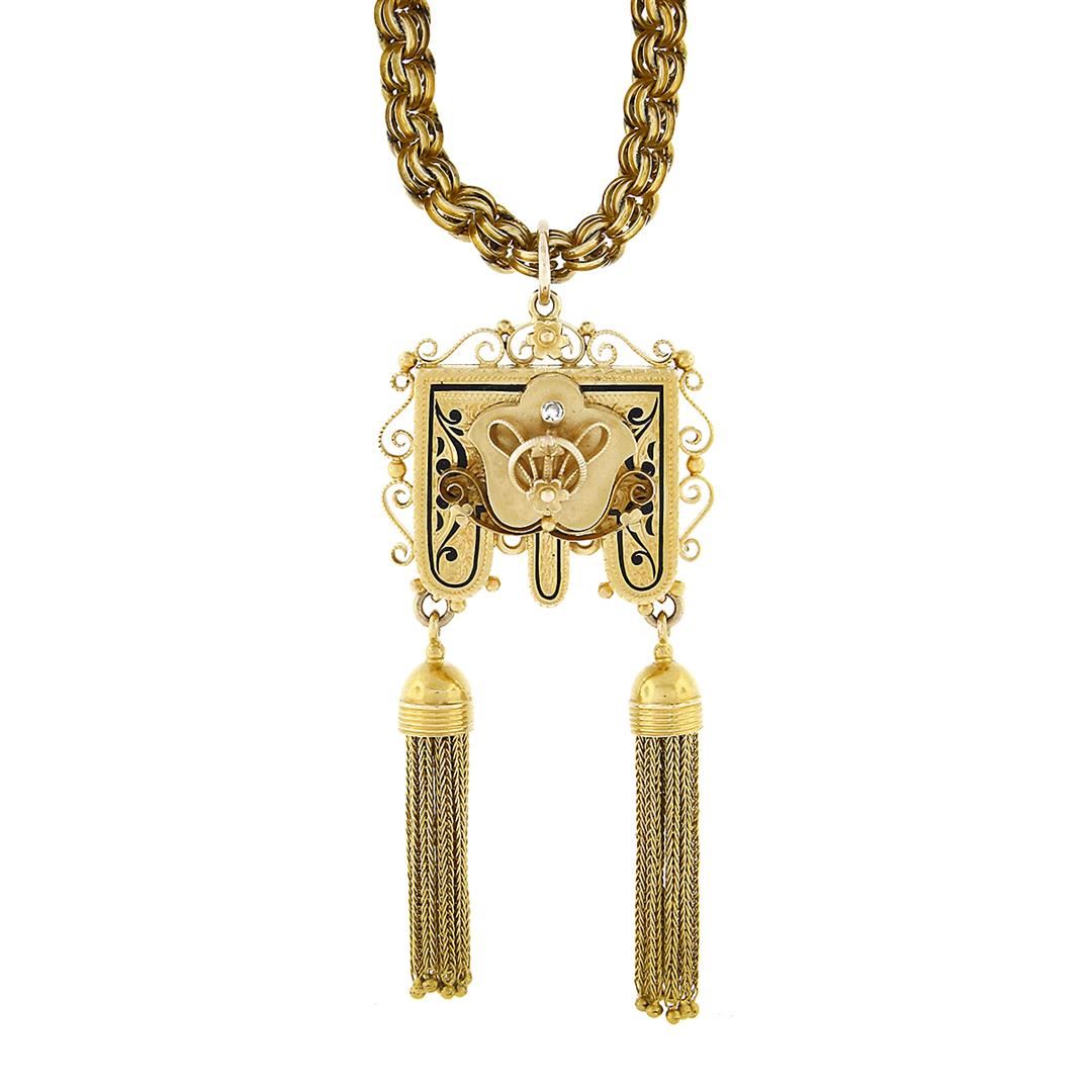 A solid 14k yellow gold tassel pendant necklace, with enamel work & 1 old single cut natural diamond (G - VS2 ; 0.05ct). 24.5 inch fancy interlocking dual circle link chain, 47.11 grams total weight, pendant measures 83.80x34.15mm.